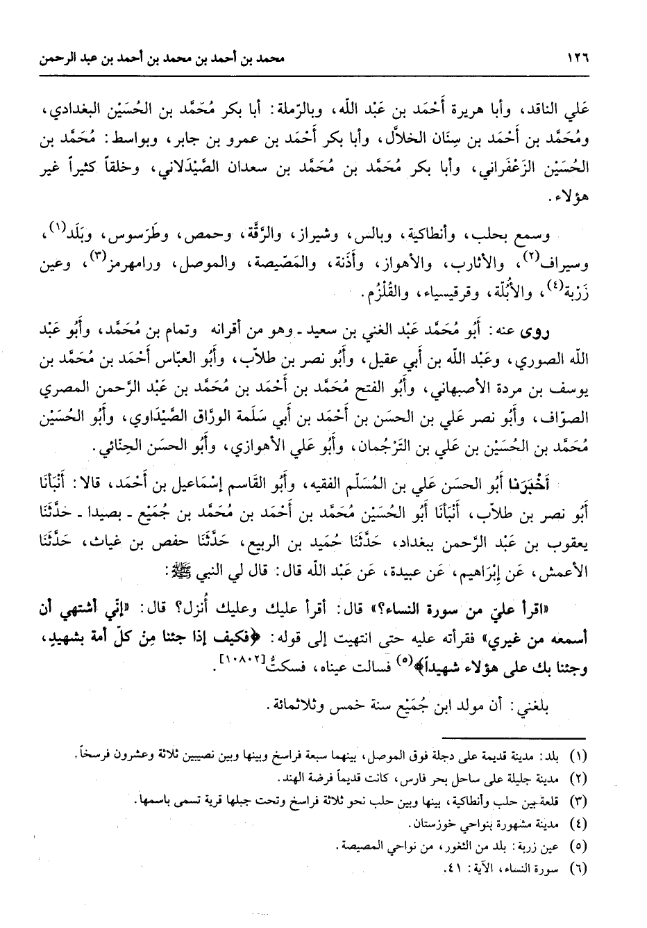 علي الناقد وأبا هريرة أحمد بن عبد الله وبالرملة أبا بكر محمد بن الحسين البغدادي ومحمد بن أحمد بن سنان الخلال وأبا بكر أحمد بن عمرو بن جابر وبواسط محمد بن الحسين الزعفراني وأبا بكر محمد بن محمد بن سعدان الصيدلاني وخلقا كثيرا غير هؤلاء وسمع بحلب وأنطاكية وبالس وشيراز والرقة وحمص وطرسوس وبلد (1) وسيراف (2) والأثارب والأهواز وأذنة والمصيصية والموصل ورامهرمز (3) وعين زربة (4) والأبلة وقرقيسياء والقلزم روى عنه أبو محمد عبد الغني بن سعيد وهو من أقرانه وتمام بن محمد وأبو عبد الله الصوري وعبد الله بن أبي عقيل وأبو نصر بن طلاب وأبو العباس أحمد بن محمد بن يوسف بن مردة الأصبهاني وأبو الفتح محمد بن أحمد بن محمد بن عبد الرحمن المصري الصواف وأبو نصر علي بن الحسن بن أحمد بن أبي سلمة الوراق الصيداوي وأبو الحسين محمد بن الحسين بن علي بن الترجمان وأبو علي الأهوازي وأبو الحسن الحنائي أخبرنا أبو الحسن علي بن المسلم الفقيه وأبو القاسم إسماعيل بن أحمد قالا أنبأنا أبو نصر بن طلاب أنبأنا أبو الحسين محمد بن أحمد بن محمد بن جميع بصيدا حدثنا يعقوب بن عبد الرحمن ببغداد حدثنا حميد بن الربيع حدثنا حفص بن غياث حدثنا الأعمش عن إبراهيم عن عبيدة عن عبد الله قال قال لي النبي (صلى الله عليه وسلم) اقرأ علي من سورة النساء قال أقرأ عليك وعليك أنزل قال إني أشتهي أن أسمعه من غيري فقرأته عليه حتى انتهيت إلى قوله " فكيف إذا جئنا من كل أمة بشهيد وجئنا بك على هؤلاء شهيدا " (5) فسالت عيناه فسكت
