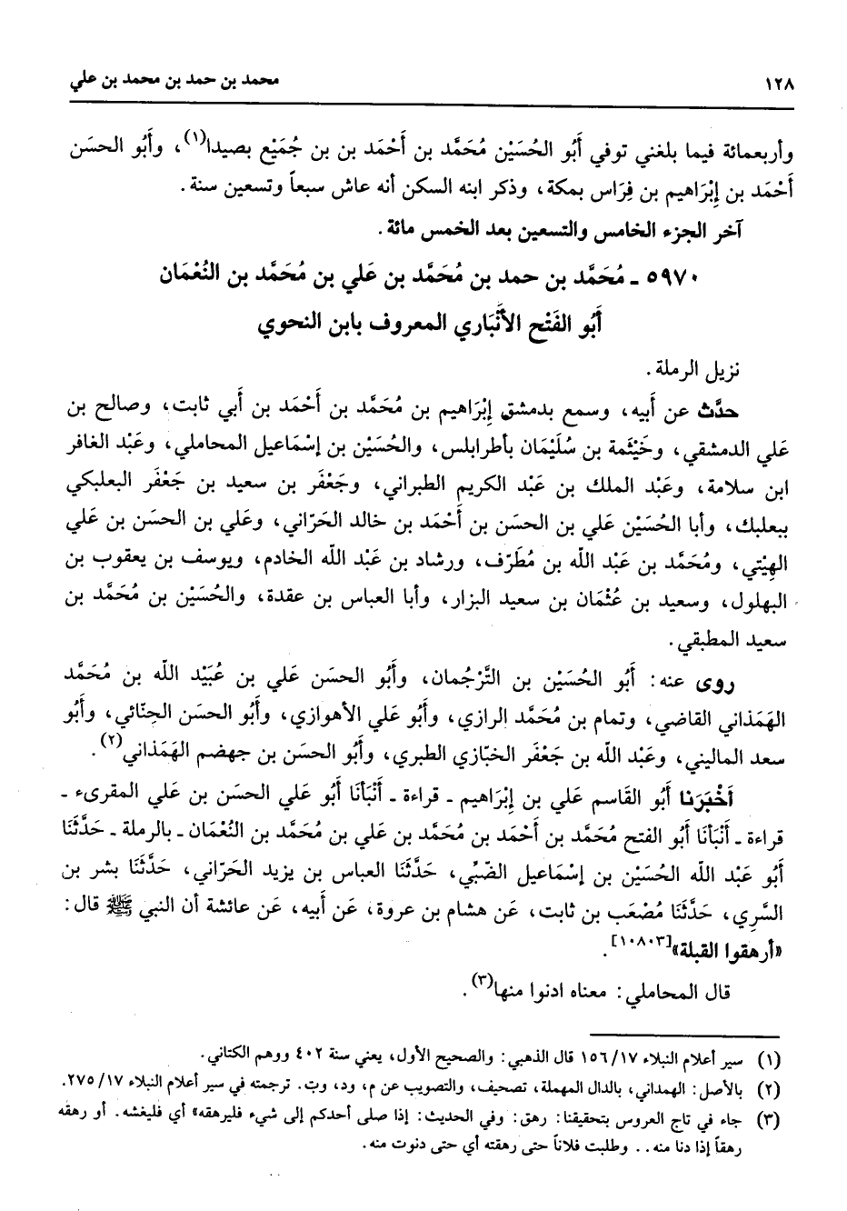 5970 - محمد بن حمد بن محمد بن علي بن محمد بن النعمان أبو الفتح الأنباري المعروف بابن النحوي نزيل الرملة حدث عن أبيه وسمع بدمشق إبراهيم بن محمد بن أحمد بن أبي ثابت وصالح بن علي الدمشقي وخيثمة بن سليمان بأطرابلس والحسين بن إسماعيل المحاملي وعبد الغافر ابن سلامة وعبد الملك بن عبد الكريم الطبراني وجعفر بن سعيد بن جعفر البعلبكي ببعلبك وأبا الحسين علي بن الحسن بن أحمد بن خالد الحراني وعلي بن الحسن بن علي الهيتي ومحمد بن عبد الله بن مطرف ورشاد بن عبد الله الخادم ويوسف بن يعقوب بن البهلول وسعيد بن عثمان بن سعيد البزاز وأبا العباس بن عقدة والحسين بن محمد بن سعيد المطبقي روى عنه أبو الحسين بن الترجمان وأبو الحسن علي بن عبيد الله بن محمد الهمذاني القاضي وتمام بن محمد الرازي وأبو علي الأهوازي وأبو الحسن الحنائي وأبو سعد الماليني وعبد الله بن جعفر الخبازي الطبري وأبو الحسن بن جهضم الهمذاني (2) أخبرنا أبو القاسم علي بن إبراهيم قراءة أنبأنا أبو علي الحسن بن علي المقرئ قراءة أنبأنا أبو الفتح محمد بن أحمد بن محمد بن علي بن محمد بن النعمان بالرملة حدثنا أبو عبد الله الحسين بن إسماعيل الضبي حدثنا العباس بن يزيد الحراني حدثنا بشر بن السري حدثنا مصعب بن ثابت عن هشام بن عروة عن أبيه عن عائشة أن النبي (صلى الله عليه وسلم) قال أرهقوا القبلة