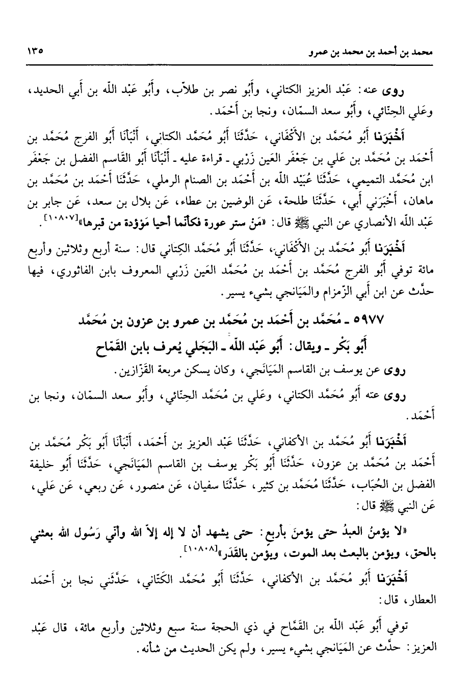 5977 - محمد بن أحمد بن محمد بن عمرو بن عزون بن محمد أبو بكر ويقال أبو عبد الله البجلي يعرف بابن القماح روى عن يوسف بن القاسم الميانجي وكان يسكن مربعة القزازين روى عنه أبو محمد الكتاني وعلي بن محمد الحنائي وأبو سعد السمان ونجا بن أحمد أخبرنا أبو محمد بن الأكفاني حدثنا عبد العزيز بن أحمد أنبأنا أبو بكر محمد بن أحمد بن محمد بن عزون حدثنا أبو بكر يوسف بن القاسم الميانجي حدثنا أبو خليفة الفضل بن الحباب حدثنا محمد بن كثير حدثنا سفيان عن منصور عن ربعي عن علي عن النبي (صلى الله عليه وسلم) قال لا يؤمن العبد حتى يؤمن بأربع حتى يشهد أن لا إله إلا الله وأني رسول الله بعثني بالحق ويؤمن بالبعث بعد الموت ويؤمن بالقدر