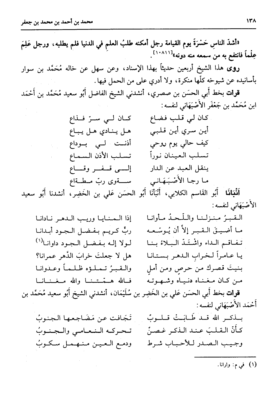 [10811] روى هذا الشيخ أربعين حديثا بهذا الإسناد وعن سهل عن خاله محمد بن سوار بأسانيده عن شيوخه كلها منكرة ولا أدري على من الحمل فيها قرأت بخط أبي الحسن بن صصري أنشدني الشيخ الفاضل أبو سعيد محمد بن أحمد ابن محمد بن جعفر الأصبهاني لنفسه * كان لي قلب فضاع * كان لي سر فذاع أين سري أين قلبي * هل ينادي هل يباع كيف حالي يوم روحي * أذنت لي بوداع تسلب العينان نورا * تسلب الأذن السماع ينقل العبد عن الدار * إلى قفر وقاع ما رجا الأصبهاني * سة وي رب مطة اع * أنبأنا أبو القاسم الكلابي أنبأنا أبو الحسن علي بن الخضر أنشدنا أبو سعيد الأصبهاني لنفسه * القبر منزلنا واللحد مأوانا * إذا المنايا وريب الدهر نادانا ما أضيق القبر إلا أن يوسعه * رب كريم بفضل الجود أبدانا تفاقم الداء واشتد البلاء بنا * لولا إله بفضل الجود داوانا (1) يا عامرا لخراب الدهر بستانا * هل لا جعلت خراب الدهر عمرانا بنيت قصرك من حرص ومن أمل * والقبر تملؤه ظلما وعدوانا من كان مغناه دنياه وشهوته * فالله همتنا والله مغنانا * قرأت بخط أبي الحسن علي بن الخضر بن سليمان أنشدني الشيخ أبو سعيد محمد بن أحمد الأصبهاني لنفسه * بذكر الله قد طابت قلوب * تجافت عن مضاجعها الجنوب كأن القلب عند الذكر غصن * تحركه النعامي والجنوب وجيب الصدر للأحباب شرط * ودمع العين منهمل سكوب