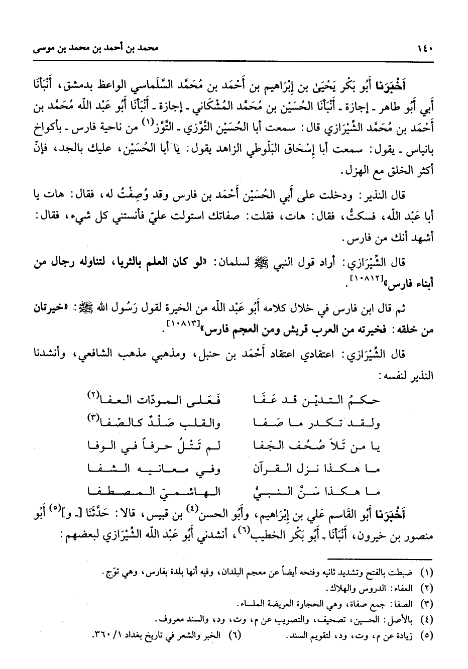 أخبرنا أبو بكر يحيى بن إبراهيم بن أحمد بن محمد السلماسي الواعظ بدمشق أنبأنا أبي أبو طاهر إجازة أنبأنا الحسين بن محمد المشكاني إجازة أنبأنا أبو عبد الله محمد بن أحمد بن محمد الشيرازي قال سمعت أبا الحسين التوزي التوز (1) من ناحية فارس بأكواخ بانياس يقول سمعت أبا إسحاق البلوطي الزاهد يقول يا أبا الحسين عليك بالجد فإن أكثر الخلق مع الهزل قال النذير ودخلت على أبي الحسين أحمد بن فارس وقد وصفت له فقال هات يا أبا عبد الله فسكت فقال هات فقلت صفاتك استولت علي فأنستني كل شئ فقال أشهد أنك من فارس قال الشيرازي أراد قول النبي (صلى الله عليه وسلم) لسمان لو كان العلم بالثريا لتناوله رجال من أبناء فارس