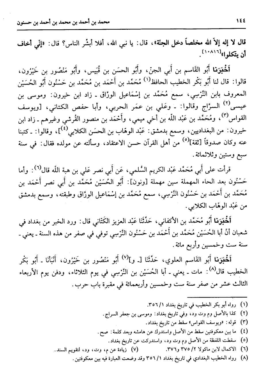 (8) رواه الخطيب البغدادي في تاريخ بغداد 1 / 356 وقد وضعت العبارة فيه بين معكوفتين
