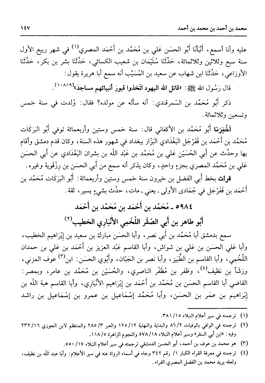 5984 - محمد بن أحمد بن محمد بن أحمد أبو طاهر بن أبي الصقر اللخمي الأنباري الخطيب (2) سمع بدمشق أبا محمد بن أبي نصر وأبا الحسن مبارك بن سعيد بن إبراهيم الخطيب وأبا علي الحسن بن علي بن شواش وأبا القاسم عبد العزيز بن أحمد بن علي بن حمدان اللخمي وأبا القاسم بن الطبيز وأبا نصر بن الجبان وأبوي الحسن ابن (3) عوف المزني ورشأ بن نظيف (4) وظفر بن مظفر الناصري والحسين بن محمد بن عامر وبمصر القاضي أبا القاسم الحسن بن محمد بن أحمد بن إبراهيم الأنباري وأبا القاسم هبة الله بن إبراهيم بن عمر بن الحسن وأبا محمد إسماعيل بن عمرو بن إسماعيل بن راشد