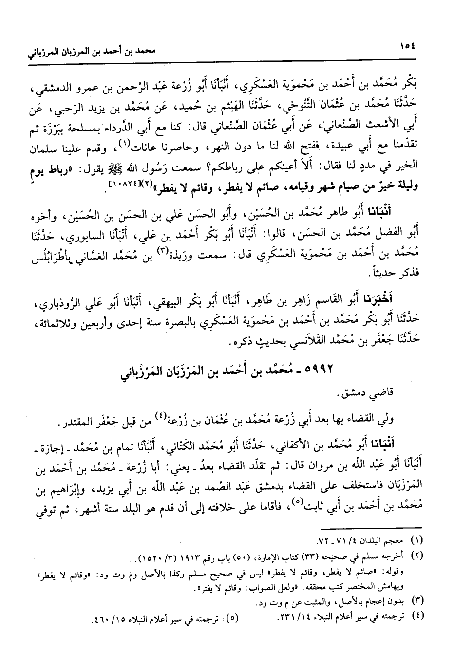 5992 - محمد بن أحمد بن المرزبان المرزباني قاضي دمشق ولي القضاء بها بعد أبي زرعة محمد بن عثمان بن زرعة (4) من قبل جعفر المقتدر أنبأنا أبو محمد بن الأكفاني حدثنا أبو محمد الكتاني أنبأنا تمام بن محمد إجازة أنبأنا أبو عبد الله بن مروان قال ثم تقلد القضاء بعد يعني أبا زرعة محمد بن أحمد بن المرزبان فاستخلف على القضاء بدمشق عبد الصمد بن عبد الله بن أبي يزيد وإبراهيم بن محمد بن أحمد بن أبي ثابت فأقاما على خلافته إلى أن قدم هو البلد ستة أشهر ثم توفي