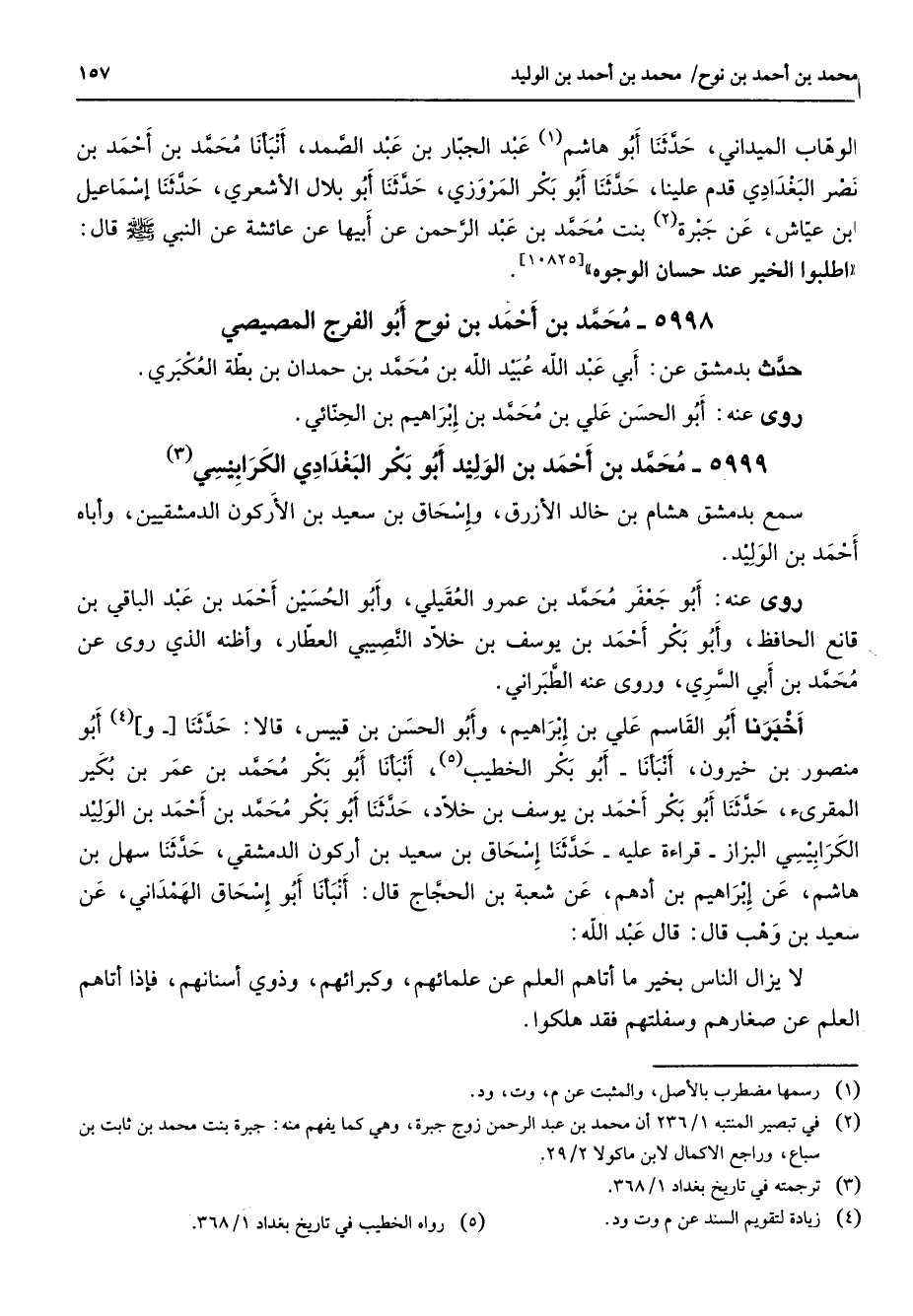 5999 - محمد بن أحمد بن الوليد أبو بكر البغدادي الكرابيسي (3) سمع بدمشق هشام بن خالد الأزرق وإسحاق بن سعيد بن الأركون الدمشقيين وأباه أحمد بن الوليد روى عنه أبو جعفر محمد بن عمرو العقيلي وأبو الحسين أحمد بن عبد الباقي بن قانع الحافظ وأبو بكر أحمد بن يوسف بن خلاد النصيبي العطار وأظنه الذي روى عن محمد بن أبي السري وروى عنه الطبراني أخبرنا أبو القاسم علي بن إبراهيم وأبو الحسن بن قبيس قالا حدثنا و (4) أبو منصور بن خيرون أنبأنا أبو بكر الخطيب (5) أنبأنا أبو بكر محمد بن عمر بن بكير المقرئ حدثنا أبو بكر أحمد بن يوسف بن خلاد حدثنا أبو بكر محمد بن أحمد بن الوليد الكرابيسي البزاز قراءة عليه حدثنا إسحاق بن سعيد بن أركون الدمشقي حدثنا سهل بن هاشم عن إبراهيم بن أدهم عن شعبة بن الحجاج قال أنبأنا أبو إسحاق الهمداني عن سعيد بن وهب قال قال عبد الله لا يزال الناس بخير ما أتاهم العلم عن علمائهم وكبرائهم وذوي أسنانهم فإذا أتاهم العلم عن صغارهم وسفلتهم فقد هلكوا