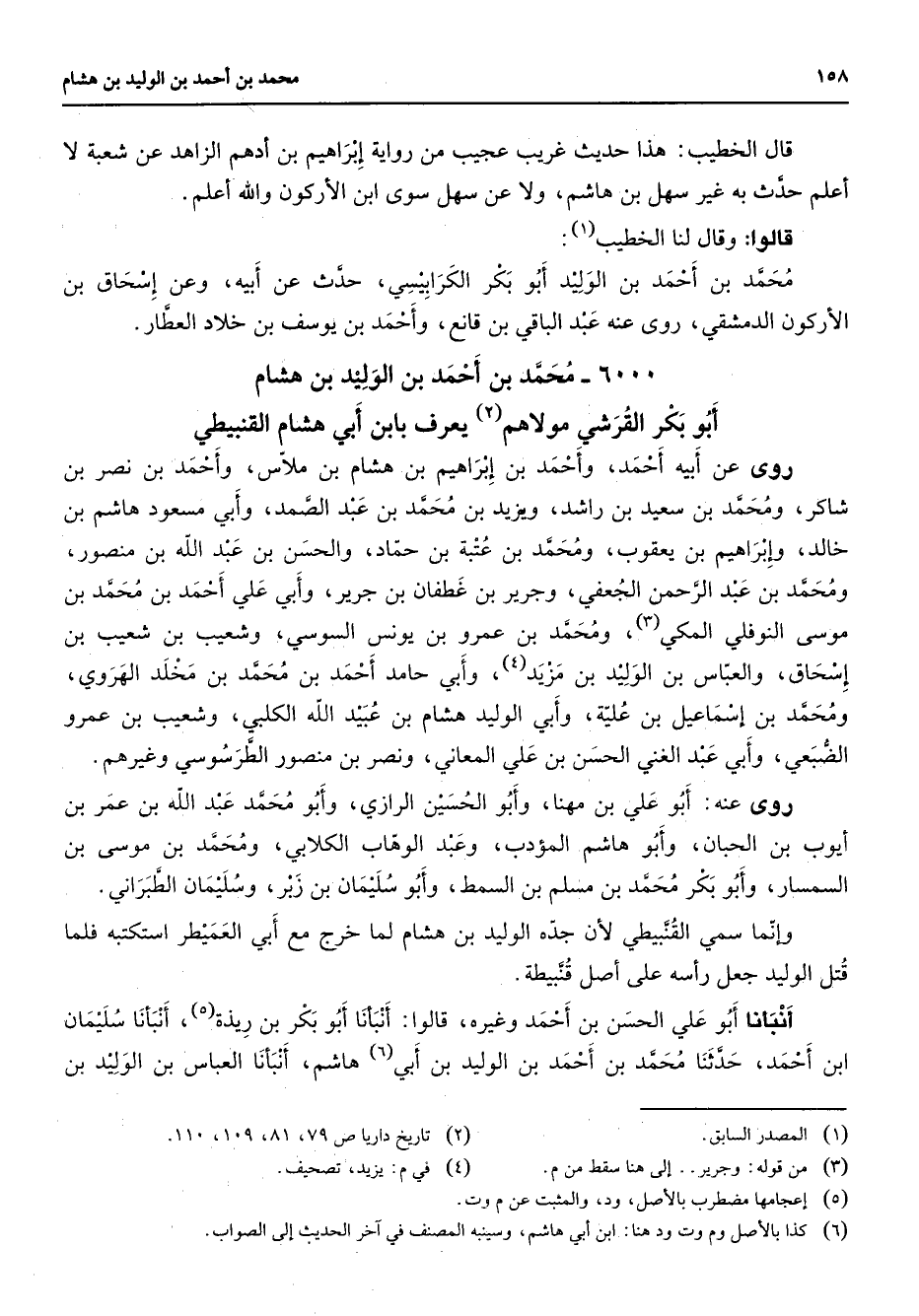 6000 - محمد بن أحمد بن الوليد بن هشام أبو بكر القرشي مولاهم (2) يعرف بابن أبي هشام القنبيطي روى عن أبيه أحمد وأحمد بن إبراهيم بن هشام بن ملاس وأحمد بن نصر بن شاكر ومحمد بن سعيد بن راشد ويزيد بن محمد بن عبد الصمد وأبي مسعود هاشم بن خالد وإبراهيم بن يعقوب ومحمد بن عتبة بن حماد والحسن بن عبد الله بن منصور ومحمد بن عبد الرحمن الجعفي وجرير بن غطفان بن جرير وأبي علي أحمد بن محمد بن موسى النوفلي المكي (3) ومحمد بن عمرو بن يونس السوسي وشعيب بن شعيب بن إسحاق والعباس بن الوليد بن مزيد (4) وأبي حامد أحمد بن محمد بن مخلد الهروي ومحمد بن إسماعيل بن علية وأبي الوليد هشام بن عبيد الله الكلبي وشعيب بن عمرو الضبعي وأبي عبد الغني الحسن بن علي المعاني ونصر بن منصور الطرسوسي وغيرهم روى عنه أبو علي بن مهنا وأبو الحسين الرازي وأبو محمد عبد الله بن عمر بن أيوب بن الحبان وأبو هاشم المؤدب وعبد الوهاب الكلابي ومحمد بن موسى بن السمسار وأبو بكر محمد بن مسلم بن السمط وأبو سليمان بن زبر وسليمان الطبراني وإنما سمي القنبيطي لأن جده الوليد بن هشام لما خرج مع أبي العميطر استكتبه فلما قتل الوليد جعل رأسه على أصل قنبيطة أنبأنا أبو علي الحسن بن أحمد وغيره قالوا أنبأنا أبو بكر بن ريذة (5) أنبأنا سليمان ابن أحمد حدثنا محمد بن أحمد بن الوليد بن أبي (6) هاشم أنبأنا العباس بن الوليد بن