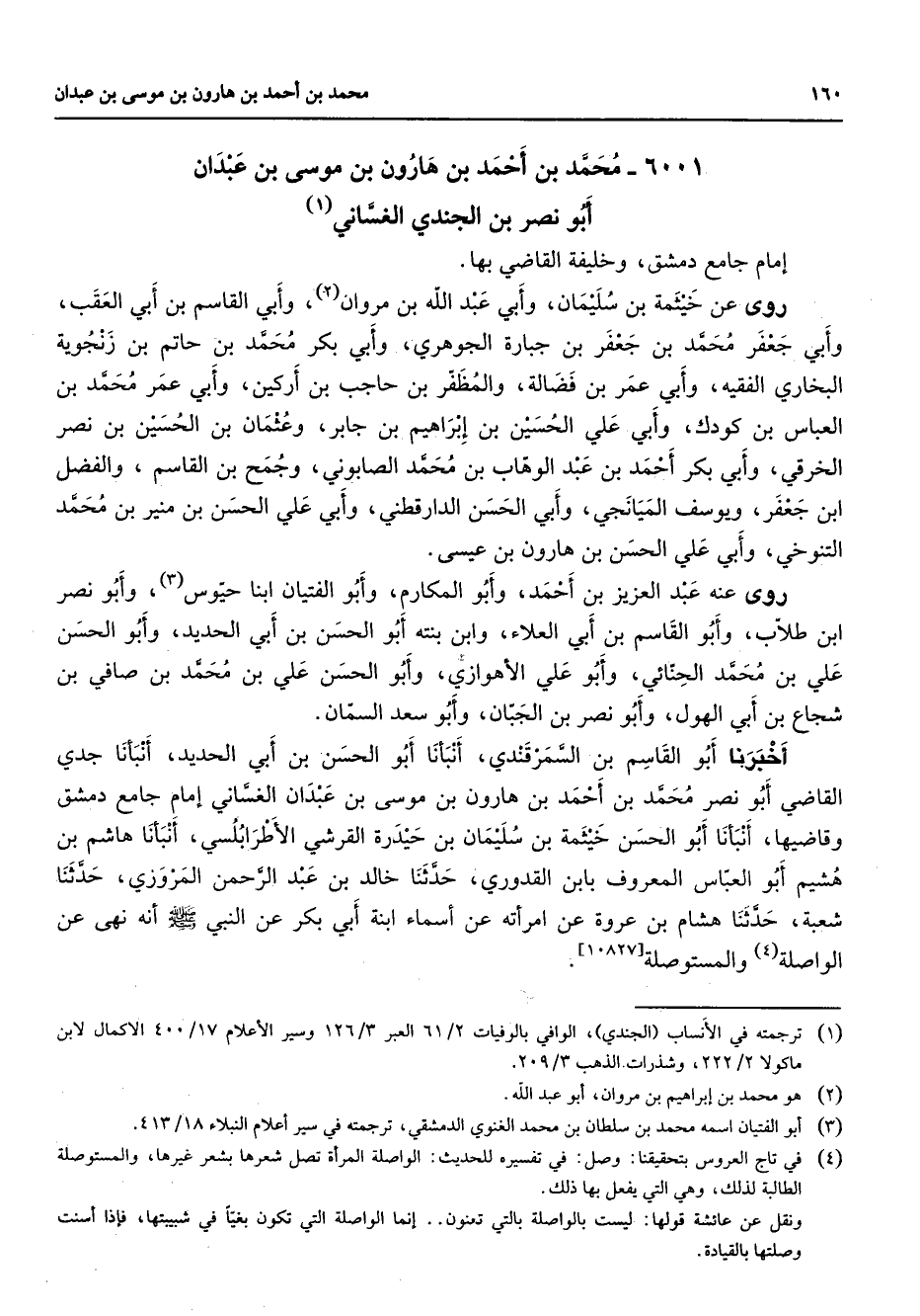 6001 - محمد بن أحمد بن هارون بن موسى بن عبدان أبو نصر بن الجندي الغساني (1) إمام جامع دمشق وخليفة القاضي بها روى عن خيثمة بن سليمان وأبي عبد الله بن مروان (2) وأبي القاسم بن أبي العقب وأبي جعفر محمد بن جعفر بن جبارة الجوهري وأبي بكر محمد بن حاتم بن زنجوية البخاري الفقيه وأبي عمر بن فضالة والمظفر بن حاجب بن أركين وأبي عمر محمد بن العباس بن كودك وأبي علي الحسين بن إبراهيم بن جابر وعثمان بن الحسين بن نصر الخرقي وأبي بكر أحمد بن عبد الوهاب بن محمد الصابوني وجمح بن القاسم والفضل بن جعفر ويوسف الميانجي وأبي الحسن الدارقطني وأبي علي الحسن بن منير بن محمد التنوخي وأبي علي الحسن بن هارون بن عيسى روى عنه عبد العزيز بن أحمد وابو المكارم وأبو الفتيان ابنا حيوس (3) وأبو نصر ابن طلاب وأبو القاسم بن أبي العلاء وابن بنته أبو الحسن بن أبي الحديد وأبو الحسن علي بن محمد الحنائي وابو علي الأهوازي وأبو الحسن علي بن محمد بن صافي بن شجاع بن أبي الهول وأبو نصر بن الجبان وأبو سعد السمان أخبرنا أبو القاسم بن السمرقندي أنبأنا أبو الحسن بن أبي الحديد أنبأنا جدي القاضي أبو نصر محمد بن أحمد بن هارون بن موسى بن عبدان الغساني إمام جامع دمشق وقاضيها أنبأنا أبو الحسن خيثمة بن سليمان بن حيدرة القرشي الأطرابلسي أنبأنا هاشم بن هشيم أبو العباس المعروف بابن القدوري حدثنا خالد بن عبد الرحمن المروزي حدثنا شعبة حدثنا هشام بن عروة عن امرأته عن أسماء ابنة أبي بكر عن النبي (صلى الله عليه وسلم) أنه نهى عن الواصلة (4) والمستوصلة