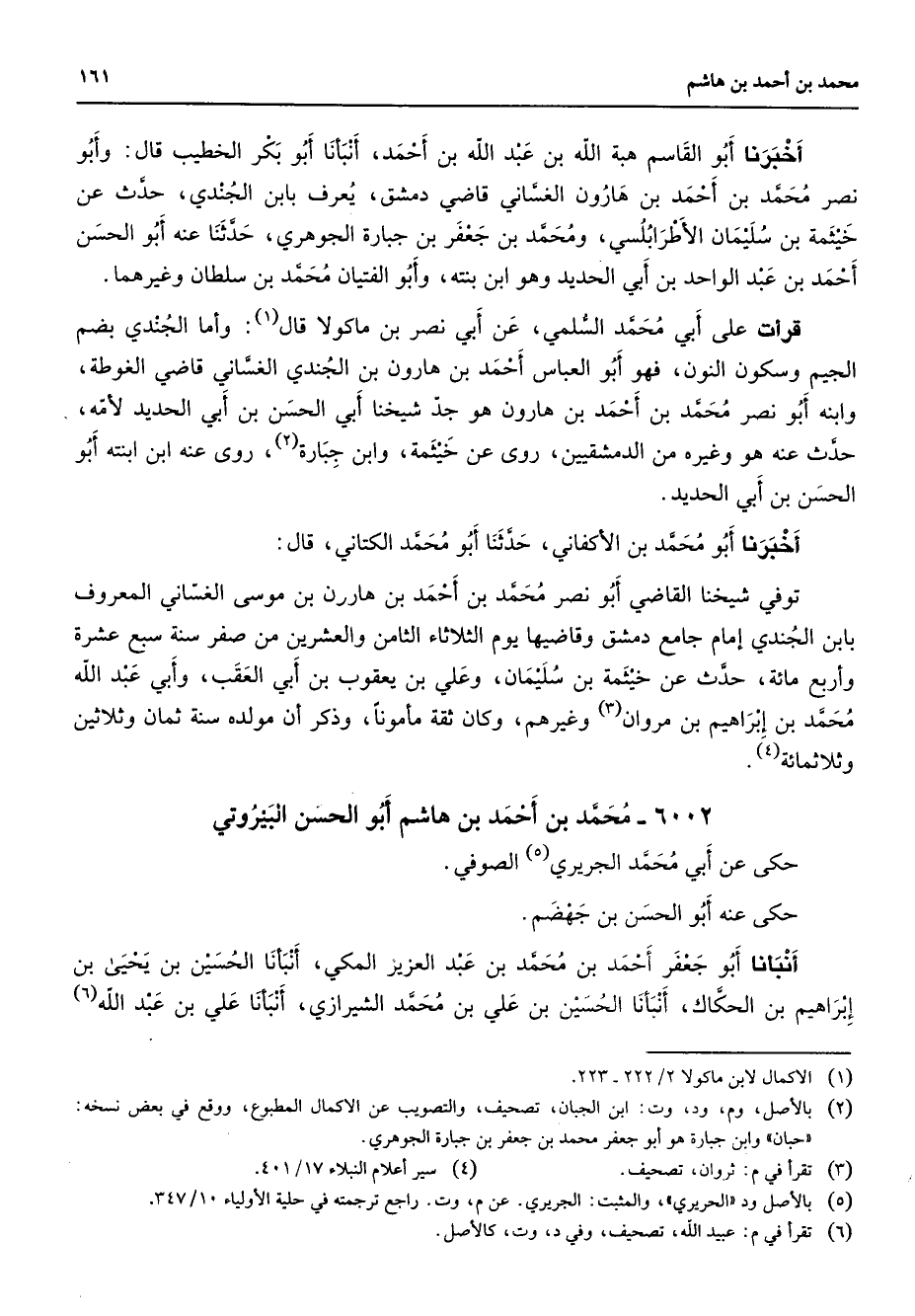 6002 - محمد بن أحمد بن هاشم أبو الحسن البيروتي حكى عن أبي محمد الجريري (5) الصوفي حكى عنه أبو الحسن بن جهضم أنبأنا أبو جعفر أحمد بن محمد بن عبد العزيز المكي أنبأنا الحسين بن يحيى بن إبراهيم بن الحكاك أنبأنا الحسين بن علي بن محمد الشيرازي أنبأنا علي بن عبد الله (6)