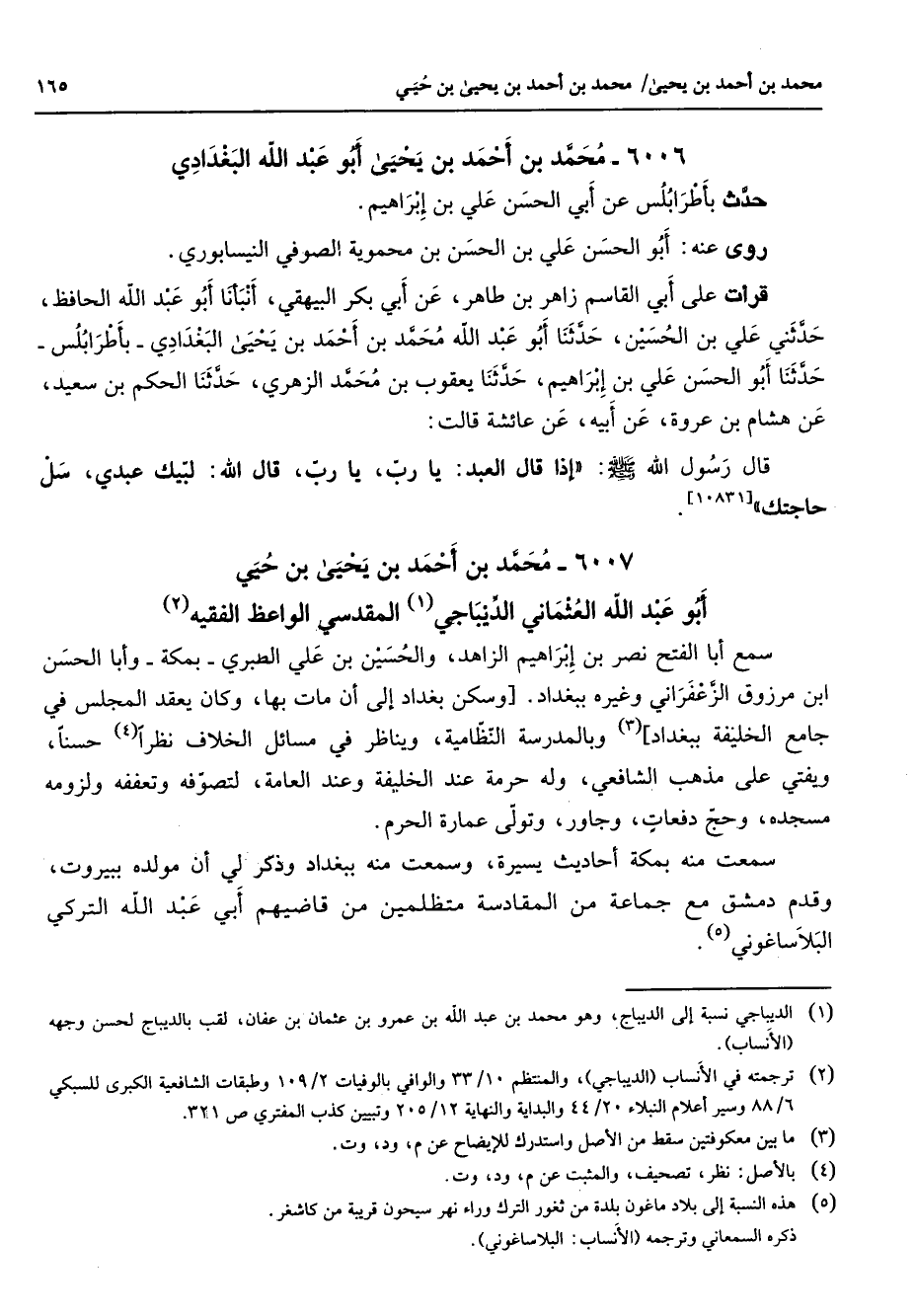 6006 - محمد بن أحمد بن يحيى أبو عبد الله البغدادي حدث بأطرابلس عن أبي الحسن علي بن إبراهيم روى عنه أبو الحسن علي بن الحسن بن محموية الصوفي النيسابوري قرأت على أبي القاسم زاهر بن طاهر عن أبي بكر البيهقي أنبأنا أبو عبد الله الحافظ حدثني علي بن الحسين حدثنا أبو عبد الله محمد بن أحمد بن يحيى البغدادي بأطرابلس حدثنا أبو الحسن علي بن إبراهيم حدثنا يعقوب بن محمد الزهري حدثنا الحكم بن سعيد عن هشام بن عروة عن أبيه عن عائشة قالت قال رسول الله (صلى الله عليه وسلم) إذا قال العبد يا رب يا رب قال الله لبيك عبدي سل حاجتك