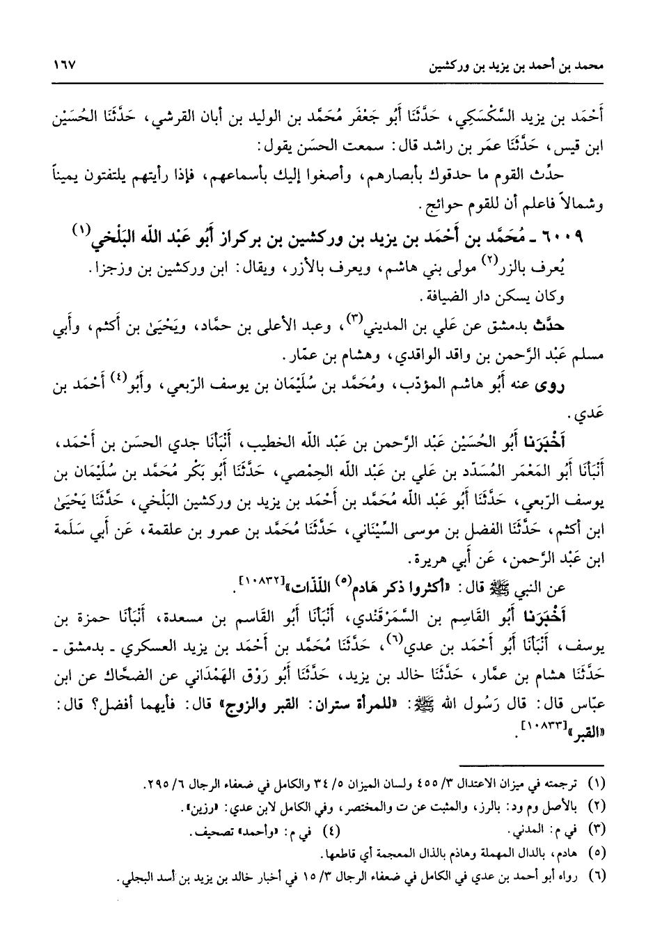 6009 - محمد بن أحمد بن يزيد بن وركشين بن بركراز أبو عبد الله البلخي (1) يعرف بالزر مولى بني هاشم (2) ويعرف بالأزر ويقال ابن وركشين بن وزجزا وكان يسكن دار الضيافة حدث بدمشق عن علي بن المديني (3) وعبد الأعلى بن حماد ويحيى بن أكثم وأبي مسلم عبد الرحمن بن واقد الواقدي وهشام بن عمار روى عنه أبو هاشم المؤدب ومحمد بن سليمان بن يوسف الربعي وأبو (4) أحمد بن عدي أخبرنا أبو الحسين عبد الرحمن بن عبد الله الخطيب أنبأنا جدي الحسن بن أحمد أنبأنا أبو المعمر المسدد بن علي بن عبد الله الحمصي حدثنا أبو بكر محمد بن سليمان بن يوسف الربعي حدثنا أبو عبد الله محمد بن أحمد بن يزيد بن وركشين البلخي حدثنا يحيى بن أكثم حدثنا الفضل بن موسى السيناني حدثنا محمد بن عمرو بن علقمة عن أبي سلمة ابن عبد الرحمن عن أبي هريرة عن النبي (صلى الله عليه وسلم) قال أكثروا ذكر هادم (5) اللذات