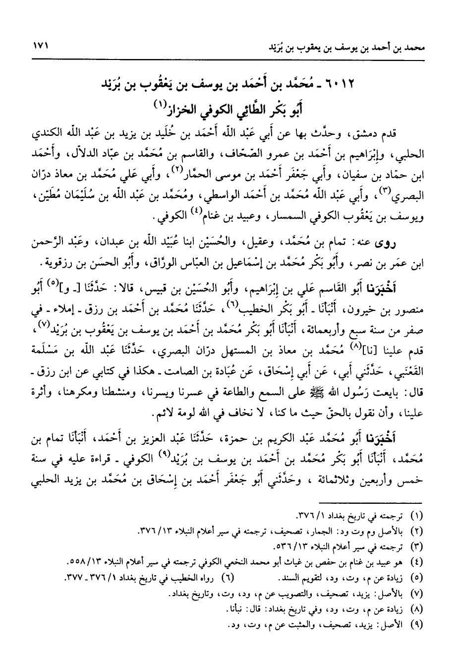 6012 - محمد بن أحمد بن يوسف بن يعقوب بن بريد أبو بكر الطائي الكوفي الخزاز (1) قدم دمشق وحدث بها عن أبي عبد الله أحمد بن خليد بن يزيد بن عبد الله الكندي الحلبي وإبراهيم بن أحمد بن عمرو الصحاف والقاسم بن محمد بن عباد الدلال وأحمد ابن حماد بن سفيان وأبي جعفر أحمد بن موسى الحمار (2) وأبي علي محمد بن معاذ دران البصري (3) وأبي عبد الله محمد بن أحمد الواسطي ومحمد بن عبد الله بن سليمان مطين ويوسف بن يعقوب الكوفي السمسار وعبيد بن غنام (4) الكوفي روى عنه تمام بن محمد وعقيل والحسين ابنا عبيد الله بن عبدان وعبد الرحمن بن عمر بن نصر وأبو بكر محمد بن إسماعيل بن العباس الوراق وأبو الحسن بن رزقوية أخبرنا أبو القاسم علي بن إبراهيم وأبو الحسين بن قبيس قالا حدثنا و (5) أبو منصور بن خيرون أنبأنا أبو بكر الخطيب (6) حدثنا محمد بن أحمد بن رزق إملاء في صفر من سنة سبع وأربعمائة أنبأنا أبو بكر محمد بن أحمد بن يوسف بن يعقوب بن بريد (7) قدم علينا نا (8) محمد بن معاذ بن المستهل دران البصري حدثنا عبد الله بن مسلمة القعنبي حدثني أبي عن أبي إسحاق عن عبادة بن الصامت هكذا في كتابي عن ابن رزق قال بايعت رسول الله (صلى الله عليه وسلم) على السمع والطاعة في عسرنا ويسرنا ومنشطنا ومكرهنا وأثرة علينا وأن نقول بالحق حيث ما كنا لا نخاف في الله لومة لائم أخبرنا أبو محمد عبد الكريم بن حمزة حدثنا عبد العزيز بن أحمد أنبأنا تمام بن محمد أنبأنا أبو بكر محمد بن أحمد بن يوسف بن بريد (9) الكوفي قراءة عليه في سنة خمس وأربعين وثلاثمائة وحدثني أبو جعفر أحمد بن إسحاق بن محمد بن يزيد الحلبي