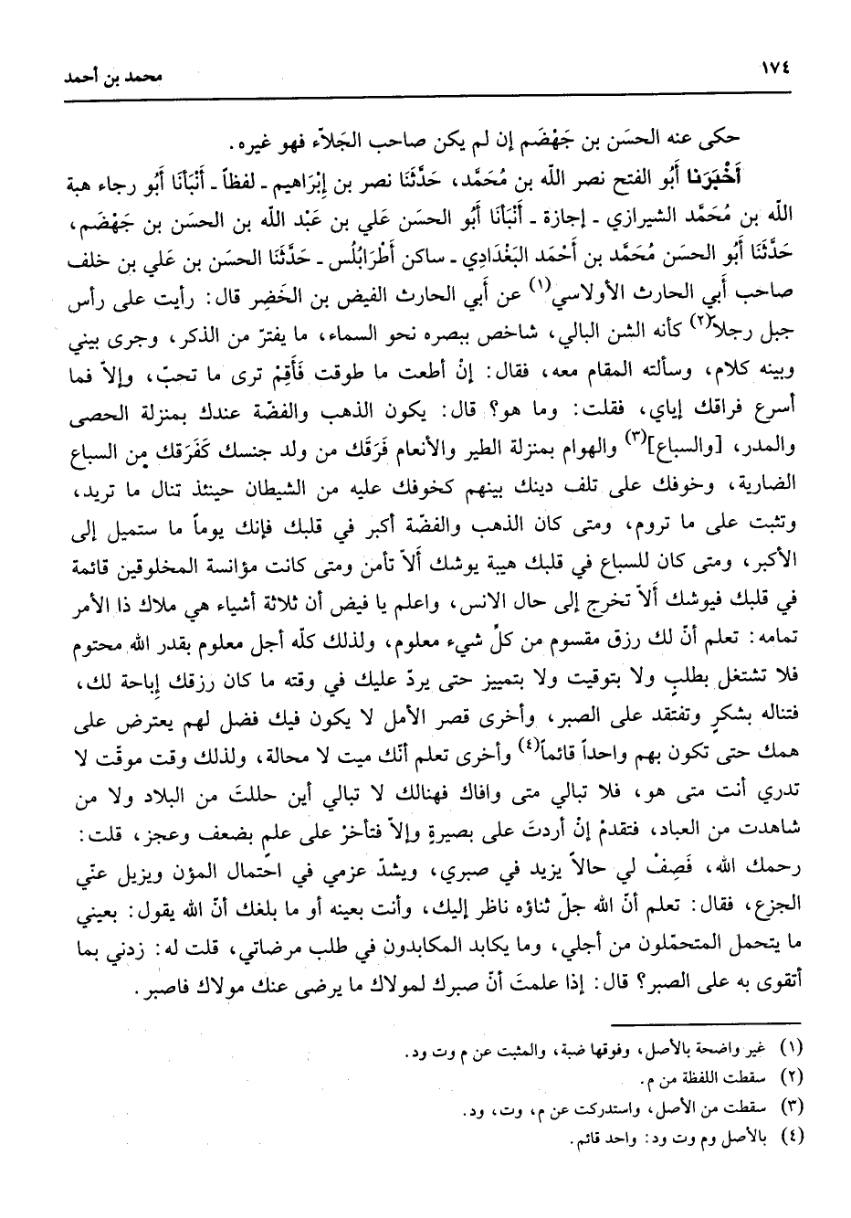 حكى عنه الحسن بن جهضم إن لم يكن صاحب الجلاء فهو غيره أخبرنا أبو الفتح نصر الله بن محمد حدثنا نصر بن إبراهيم لفظا أنبأنا أبو رجاء هبة الله بن محمد الشيرازي إجازة أنبأنا أبو الحسن علي بن عبد الله بن الحسن بن جهضم حدثنا أبو الحسن محمد بن أحمد البغدادي ساكن أطرابلس حدثنا الحسن بن علي بن خلف صاحب ابي الحارث الأولاسي (1) عن أبي الحارث الفيض بن الخضر قال رأيت على رأس جبل رجلا (2) كأنه الشن البالي شاخص ببصره نحو السماء ما يفتر من الذكر وجرى بيني وبينه كلام وسألته المقام معه فقال إن أطعت ما طوقت فأقم ترى ما تحب وإلا فما أسرع فراقك إياي فقلت وما هو قال يكون الذهب والفضة عندك بمنزلة الحصى والمدر والسباع (3) والهوام بمنزلة الطير والأنعام فرقك من ولد جنسك كفرقك من السباع الضارية وخوفك على تلف دينك بينهم كخوفك عليه من الشيطان حينئذ تنال ما تريد وتثبت على ما تروم ومتى كان الذهب والفضة أكبر في قلبك فإنك يوما ما ستميل إلى الأكبر ومتى كان للسباع في قلبك هيبة يوشك ألا تأمن ومتى كانت مؤانسة المخلوقين قائمة في قلبك فيوشك ألا تخرج إلى حال الانس واعلم يا فيض أن ثلاثة أشياء هي ملاك ذا الأمر تمامه تعلم أن لك رزق مقسوم من كل شئ معلوم ولذلك كله أجل معلوم بقدر الله محتوم فلا تشتغل بطلب ولا بتوقيت ولا بتمييز حتى يرد عليك في وقته ما كان رزقك إباحة لك فتناله بشكر وتفتقد على الصبر وأخرى قصر الأمل لا يكون فيك فضل لهم يعترض على همك حتى تكون بهم واحدا قائما (4) وأخرى تعلم أنك ميت لا محالة ولذلك وقت موقت لا تدري أنت متى هو فلا تبالي متى وافاك فهنالك لا تبالي أين حللت من البلاد ولا من شاهدت من العباد فتقدم إن أردت على بصيرة وإلا فتأخر على علم بضعف وعجز قلت رحمك الله فصف لي حالا يزيد في صبري ويشد عزمي في احتمال المؤن ويزيل عني الجزع فقال تعلم أن الله جل ثناؤه ناظر إليك وأنت بعينه أو ما بلغك أن الله يقول بعيني ما يتحمل المتحملون من أجلي وما يكابد المكابدون في طلب مرضاتي قلت له زدني بما اتقوى به على الصبر قال إذا علمت أن صبرك لمولاك ما يرضى عنك مولاك فاصبر