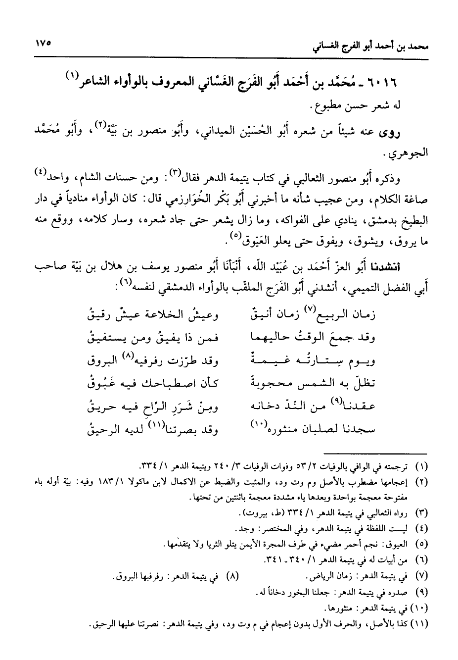 6016 - محمد بن أحمد أبو الفرج الغساني المعروف بالوأواء الشاعر (1) له شعر حسن مطبوع روى عنه شيئا من شعره أبو الحسين الميداني وأبو منصور بن بية (2) وأبو محمد الحوهري وذكره أبو منصور الثعالبي في كتاب يتيمة الدهر فقال (3) ومن حسنات الشام واحد (4) صاغة الكلام ومن عجيب شأنه ما أخبرني أبو بكر الخوارزمي قال كان الوأواء مناديا في دار البطيخ بدمشق ينادي على الفواكه وما زال يشعر حتى جاد شعره وسار كلامه ووقع منه ما يروق ويشوق ويفوق حتى يعلو العيوق (5) أنشدنا أبو العز أحمد بن عبيد الله أنبأنا أبو منصور يوسف بن هلال بن بية صاحب أبي الفضل التميمي أنشدني أبو الفرج الملقب بالوأواء الدمشقي لنفسه (6) زمان الربيع (7) زمان أنيق * وعيش الخلاعة عيش رقيق وقد جمع الوقت حيالهما * فمن ذا يفيق ومن يستفيق * ويوم ستارته غيمة * وقد طرزت رفرفيه (8) البروق تظل به الشمس محجوبة * كأن اصطحابك فيه غبوق عقدنا (9) من الند دخانه * ومن شرر الراح فيه حريق سجدنا لصلبان منثوره (10) * وقد بصرتنا (11) لديه الرحيق