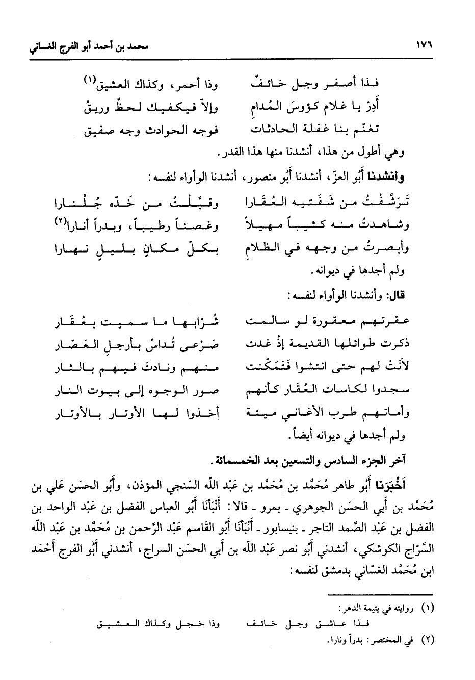 فذا أصفر وجل خائف * وذا أحمر وكذاك العشيق (1) أدر يا غلام كؤوس المدام * وإلا فيكفيك لحظ وريق تغنم بنا غفلة الحادثات * فوجه الحوادث وجه صفيق * وهي أطول من هذا أنشدنا منها هذا القدر وأنشدنا أبو العز أنشدنا أبو منصور أنشدنا الوأواء لنفسه ترشفت من شفتيه العقارا * وقبلت من خده جلنارا وشاهدت منه كثيبا مهيلا * وغصنا رطيبا وبدرا أنارا (2) وأبصرت من وجهه في الظلام * بكل مكان بليل نهارا * ولم أجدها في ديوانه قال وأنشدنا الوأواء لنفسه عقرتهم معقورة لو سالمت * شرابها ما سميت بعقار ذكرت طوائلها القديمة إذ غدت * صرعى تداس بأرجل العصار لأنت لهم حتى انتشوا فتمكنت * منهم ونادت فيهم بالثار سجدوا لكاسات العقار كأنهم * صور الوجوه إلى بيوت النار وأماتهم طرب الأغاني ميتة * أخذوا لها الأوتار بالأوتار * ولم اجدها في ديوانه أيضا آخر الجزء السادس والتسعين بعد الخمسمائة أخبرنا أبو طاهر محمد بن محمد بن عبد الله السنجي المؤذن وأبو الحسن علي بن محمد بن أبي الحسن الجوهري بمرو قالا أنبأنا أبو العباس الفضل بن عبد الواحد بن الفضل بن عبد الصمد التاجر بنيسابور أنبأنا أبو القاسم عبد الرحمن بن محمد بن عبد الله السراج الكوشكي أنشدني أبو نصر عبد الله بن أبي الحسن السراج أنشدني أبو الفرج أحمد ابن محمد الغساني بدمشق لنفسه