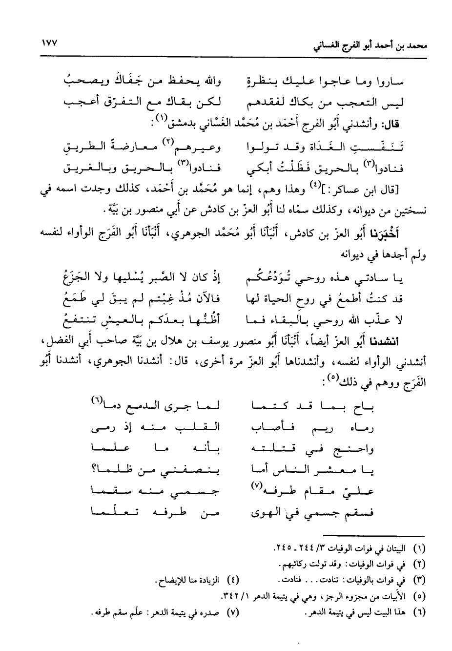 ساروا وما عاجوا عليك بنظرة * والله يحفظ من جفاك ويصحب ليس التعجب من بكاك لفقدهم * لكن بقاك مع التفرق أعجب قال وأنشدني أبو الفرج أحمد بن محمد الغساني بدمشق (1) تنفست الغداة وقد تولوا * وعيرهم (2) معارضة الطريق * فنادوا (3) بالحريق فظلت أبكي * فنادوا (3) بالحريق وبالغريق * قال ابن عساكر (4) وهذا وهم إنما هو محمد بن أحمد كذلك وجدت اسمه في نسختين من ديوانه وكذلك سماه لنا أبو العز بن كادش عن أبي منصور بن بية أخبرنا أبو العز بن كادش أنبأنا أبو محمد الجوهري أنبأنا أبو الفرج الوأواء لنفسه ولم أجدها في ديوانه يا سادتي هذه روحي تودعكم * إذ كان لا الصبر يسليها ولا الجزع قد كنت أطمع في روح الحياة لها * فالآن مذ غبتم لم يبق لي طمع لا عذب الله روحي بالبقاء فما * أظنها بعدكم بالعيش تنتفع * أنشدنا أبو العز أيضا أنبأنا أبو منصور يوسف بن هلال بن بية صاحب أبي الفضل أنشدني الوأواء لنفسه وأنشدناها أبو العز مرة أخرى قال أنشدنا الجوهري أنشدنا أبو الفرج ووهم في ذلك (5) باح بما قد كتما * لما جرى الدمع دما (6) رماه ريم فأصاب * القلب منه إذ رمى واحنج في قتلته * بأنه ما علما يا معشر الناس أما * ينصفني من ظلما * علي مقام طرفه (7) * جسمي منه سقما فسقم جسمي في الهوى * من طرفه تعلما