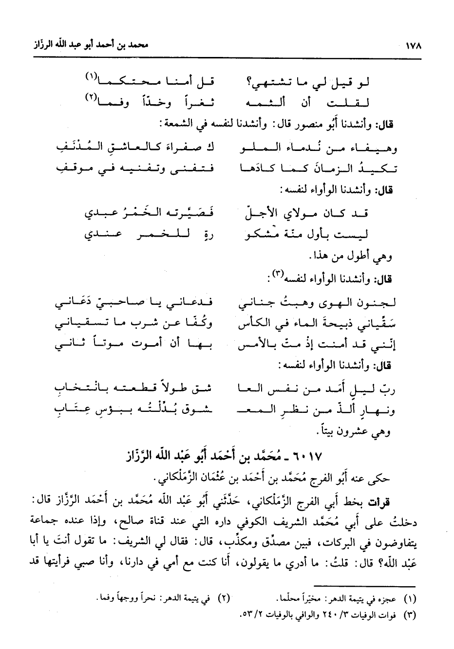 6017 - محمد بن أحمد أبو عبد الله الرزاز حكى عنه أبو الفرج محمد بن أحمد بن عثمان الزملكاني قرأت بخط أبي الفرج الزملكاني حدثني أبو عبد الله محمد بن أحمد الرزاز قال دخلت على أبي محمد الشريف الكوفي داره التي عند قناة صالح وإذا عنده جماعة يتفاوضون في البركات فبين مصدق ومكذب قال فقال لي الشريف ما تقول أنت يا أبا عبد الله قال قلت ما أدري ما يقولون أنا كنت مع أمي في دارنا وأنا صبي فرأيتها قد