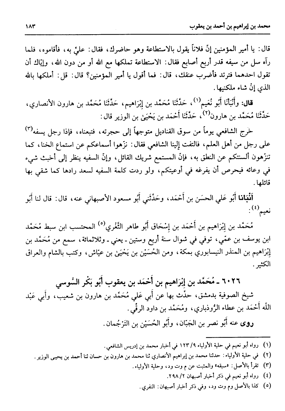 (2) حلية الاولياء: حدثنا محمد بن ابراهيم الانصاري ثنا محمد بن هارون بن حسان ثنا احمد بن يحيى الوزير
