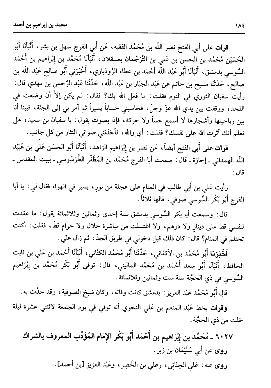 6027 - محمد بن إبراهيم بن أحمد أبو بكر الإمام المؤدب المعروف بالشراك روى عن أبي سليمان بن زبر روى عنه علي الحنائي وعلي بن الخضر وعبد العزيز بن أحمد