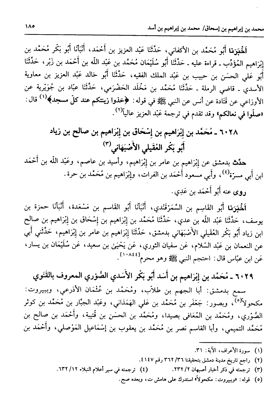 6028 - محمد بن إبراهيم بن إسحاق بن إبراهيم بن صالح بن زياد أبو بكر العقيلي الأصبهاني (3) حدث بدمشق عن إبراهيم بن عامر بن إبراهيم وأسيد بن عاصم وعبد الله بن أحمد ابن أبي مسرة (4) وأبي مسعود أحمد بن الفرات وإبراهيم بن محمد بن حرة روى عنه أبو أحمد بن عدي أخبرنا أبو القاسم بن السمرقندي أنبأنا أبو القاسم بن مسعدة أنبأنا حمزة بن يوسف حدثنا عبد الله بن عدي حدثنا محمد بن إبراهيم بن إسحاق بن إبراهيم بن صالح ابن زياد أبو بكر العقيلي الأصبهاني بدمشق حدثنا إبراهيم بن عامر بن إبراهيم حدثني أبي عن النعمان بن عبد السلام عن سفيان الثوري عن يحيى بن سعيد عن سليمان بن يسار عن ابن عباس قال احتجم النبي (صلى الله عليه وسلم) وهو محرم