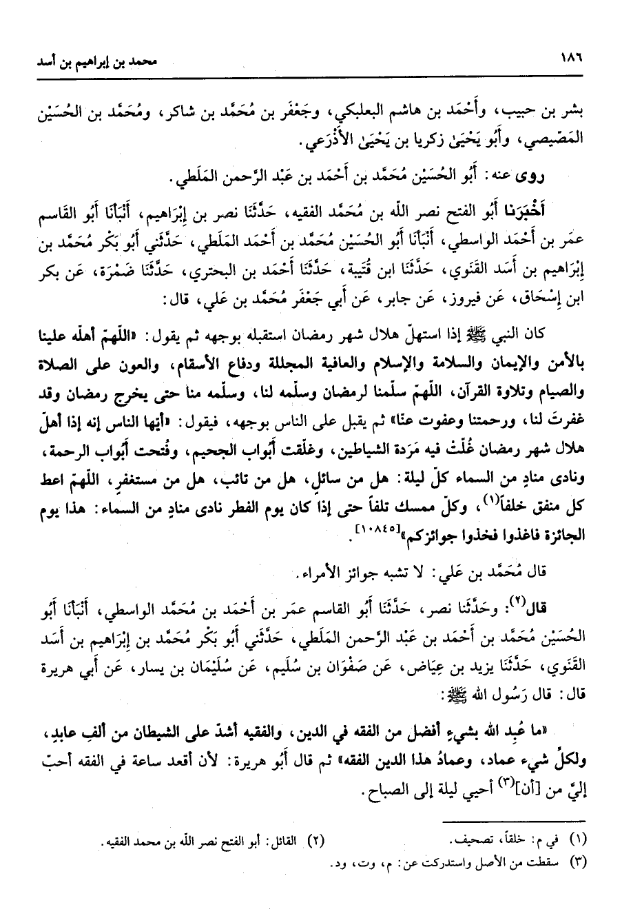 بشر بن حبيب وأحمد بن هاشم البعلبكي وجعفر بن محمد بن شاكر ومحمد بن الحسين المصيصي وابو يحيى زكريا بن يحيى الأذرعي روى عنه أبو الحسين محمد بن أحمد بن عبد الرحمن الملطي أخبرنا أبو الفتح نصر الله بن محمد الفقيه حدثنا نصر بن إبراهيم أنبأنا أبو القاسم عمر بن أحمد الواسطي أنبأنا أبو الحسين محمد بن أحمد الملطي حدثني أبو بكر محمد بن إبراهيم بن أسد القنوي حدثنا ابن قتيبة حدثنا أحمد بن البحتري حدثنا ضمرة عن بكر ابن إسحاق عن فيروز عن جابر عن أبي جعفر محمد بن علي قال كان النبي (صلى الله عليه وسلم) إذا استهل هلال شهر رمضان استقبله بوجهه ثم يقول اللهم أهله علينا بالأمن والإيمان والسلامة والإسلام والعافية المجللة ودفاع الأسقام والعون على الصلاة والصيام وتلاوة القرآن اللهم سلمنا لرمضان وسلمه لنا وسلمه منا حتى يخرج رمضان وقد غفرت لنا ورحمتنا وعفوت عنا ثم يقبل على الناس بوجهه فيقول أيها الناس إنه إذا أهل هلال شهر رمضان غلت فيه مردة الشياطين وغلقت أبواب الجحيم وفتحت أبواب الرحمة ونادى مناد من السماء كل ليلة هل من سائل هل من تائب هل من مستغفر اللهم أعط كل منفق خلفا (1) وكل ممسك تلفا حتى إذا كان يوم الفطر نادى مناد من السماء هذا يوم الجائزة فاغذوا فخذوا جوائزكم