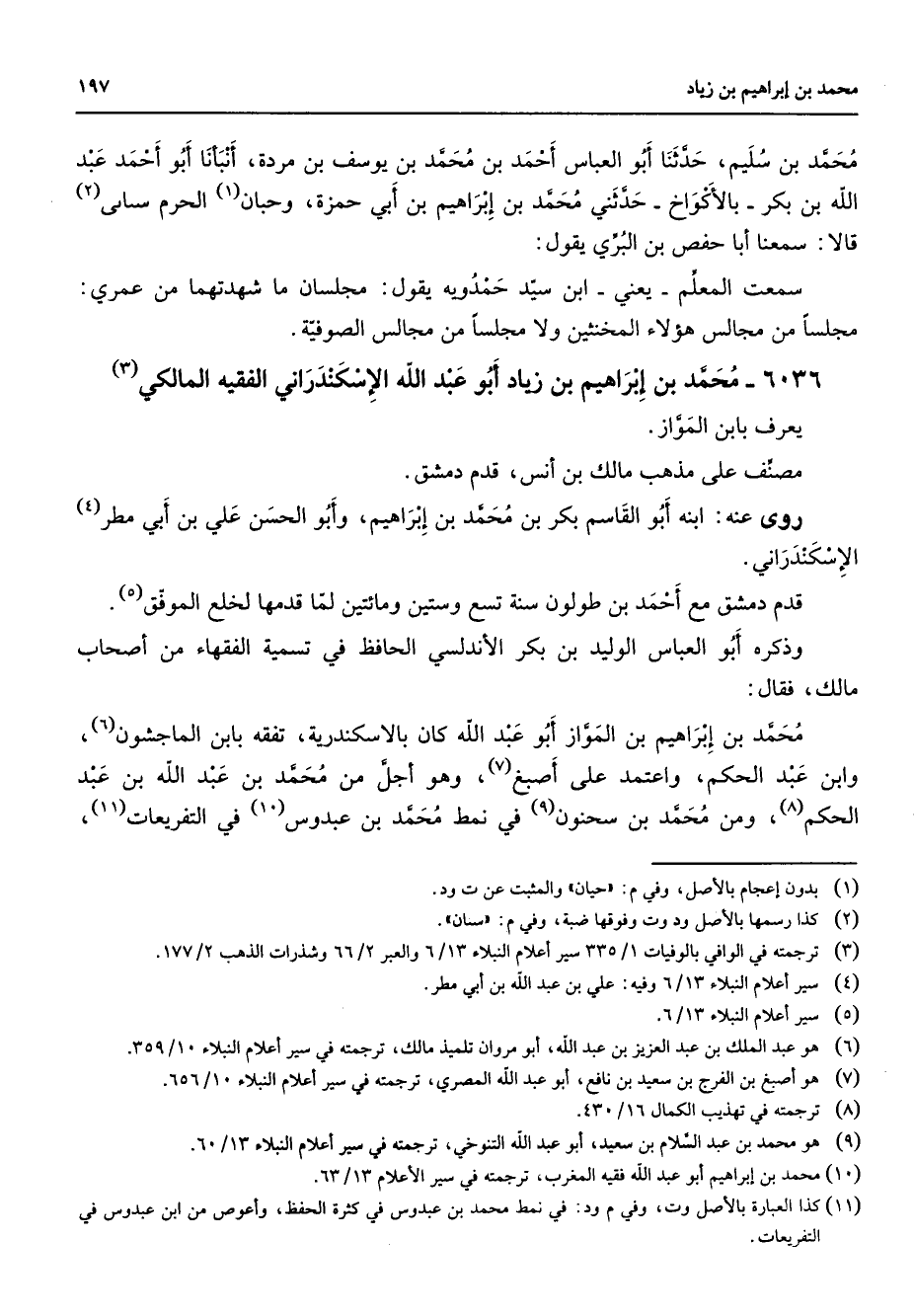6036 - محمد بن إبراهيم بن زياد أبو عبد الله الإسكندراني الفقيه المالكي (3) يعرف بابن المواز مصنف على مذهب مالك بن أنس قدم دمشق روى عنه ابنه أبو القاسم بكر بن محمد بن إبراهيم وأبو الحسن علي بن أبي مطر (4) الأسكندراني قدم دمشق مع أحمد بن طولون سنة تسع وستين ومائتين لما قدمها لخلع الموفق (5) وذكره أبو العباس الوليد بن بكر الأندلسي الحافظ في تسمية الفقهاء من أصحاب مالك فقال محمد بن إبراهيم بن المواز أبو عبد الله كان بالإسكندرية تفقه بابن الماجشون (6) وابن عبد الحكم واعتمد على أصبغ (7) وهو أجل من محمد بن عبد الله بن عبد الحكم (8) ومن محمد بن سحنون (9) في نمط محمد بن عبدوس (10) في التفريعات (11)