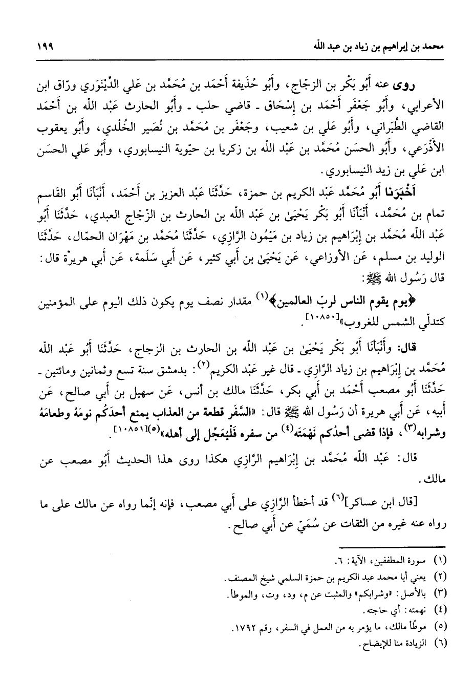 [10850] قال وأنبأنا أبو بكر يحيى بن عبد الله بن الحارث بن الزجاج حدثنا أبو عبد الله محمد بن إبراهيم بن زياد الرازي قال غير عبد الكريم (2) بدمشق سنة تسع وثمانين ومائتين حدثنا أبو مصعب أحمد بن أبي بكر حدثنا مالك بن أنس عن سهيل بن أبي صالح عن أبيه عن أبي هريرة أن رسول الله (صلى الله عليه وسلم) قال السفر قطعة من العذاب يمنع أحدكم نومه وطعامه وشرابه (3) فإذا قضى أحدكم نهمته (4) من سفره فليعجل إلى أهله (5)