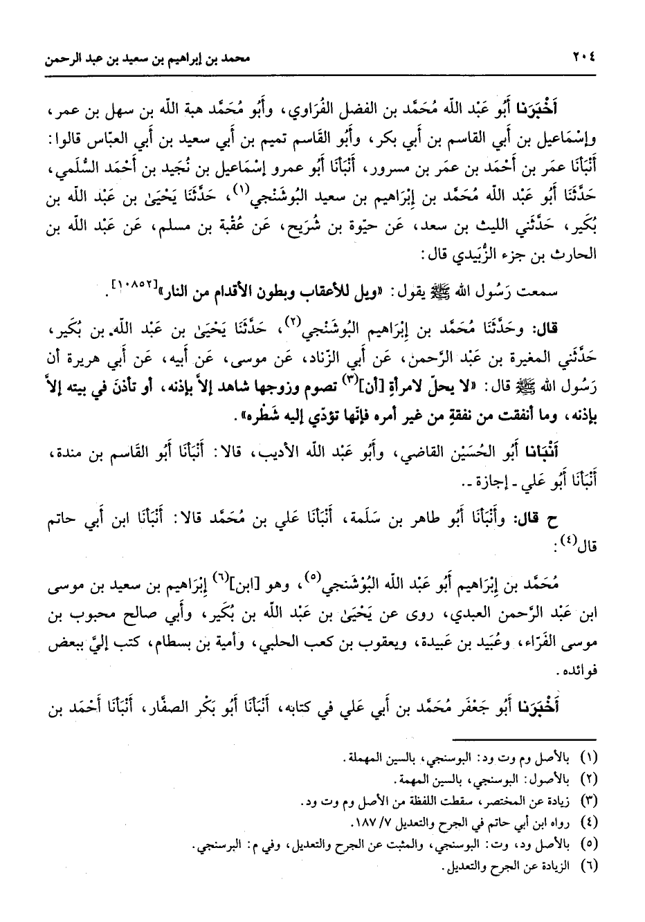 [10852] قال وحدثنا محمد بن إبراهيم البوشنجي (2) حدثنا يحيى بن عبد الله بن بكير حدثني المغيرة بن عبد الرحمن عن أبي الزناد عن موسى عن أبيه عن أبي هريرة أن رسول الله (صلى الله عليه وسلم) قال لا يحل لامرأة أن (3) تصوم وزوجها شاهد إلا بإذنه أو تأذن في بيته إلا بإذنه وما أنفقت من نفقة من غير أمره فإنها تؤدي إليه شطره أنبأنا أبو الحسين القاضي وأبو عبد الله الأديب قالا أنبأنا أبو القاسم بن مندة أنبأنا أبو علي إجازة ح قال وأنبأنا أبو طاهر بن سلمة أنبأنا علي بن محمد قالا أنبأنا ابن أبي حاتم قال (4) محمد بن إبراهيم أبو عبد الله البوشنجي (5) وهو ابن (6) إبراهيم بن سعيد بن موسى ابن عبد الرحمن العبدي روى عن يحيى بن عبد الله بن بكير وأبي صالح محبوب بن موسى الفراء وعبيد بن عبيدة ويعقوب بن كعب الحلبي وأمية بن بسطام كتب إلي ببعض فوائده أخبرنا أبو جعفر محمد بن أبي علي في كتابه أنبأنا أبو بكر الصفار أنبأنا أحمد بن