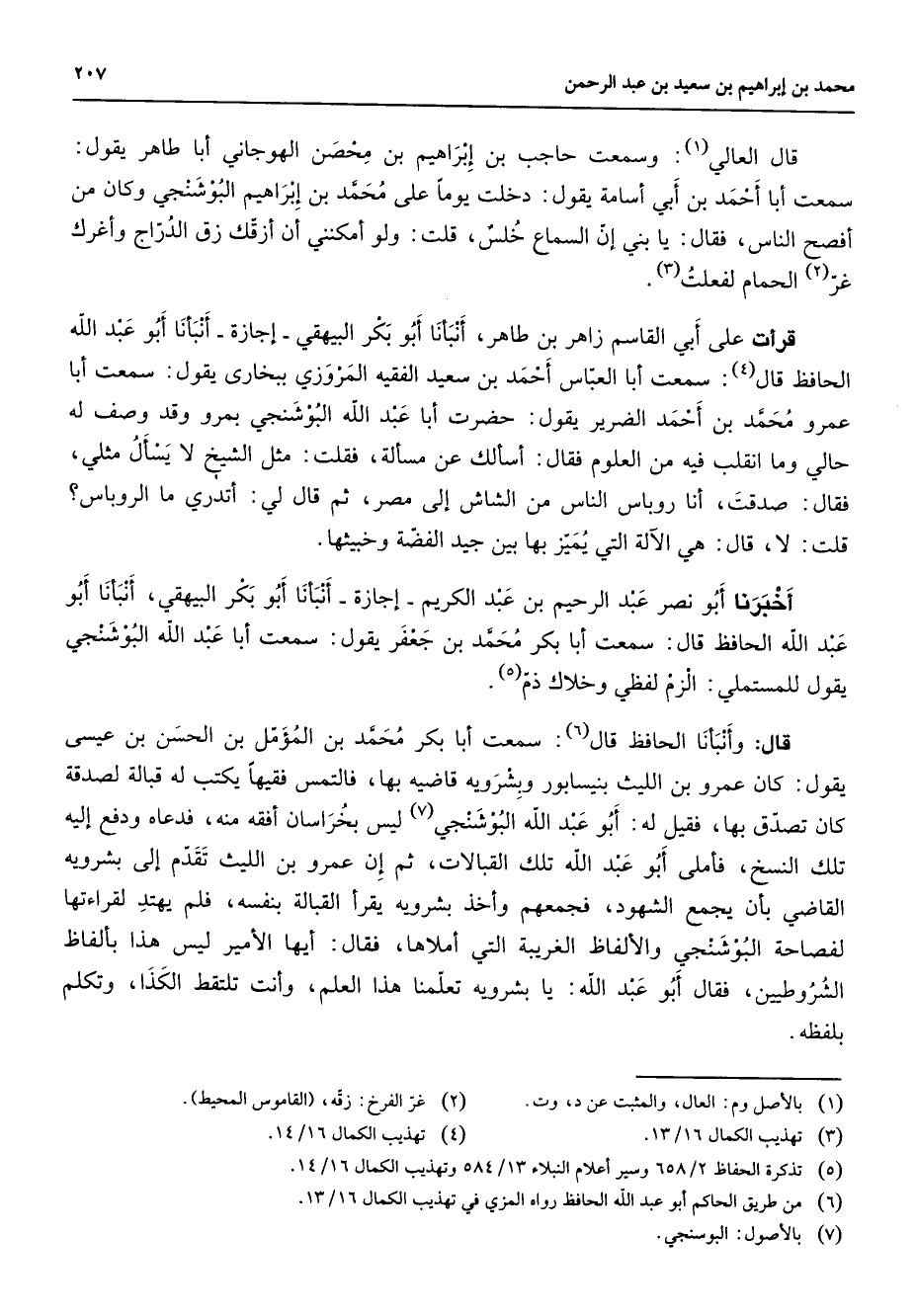 قال العالي (1) وسمعت حاجب بن إبراهيم بن محصن الهوجاني أبا طاهر يقول سمعت أبا أحمد بن أبي أسامة يقول دخلت يوما على محمد بن إبراهيم البوشنجي وكان من أفصح الناس فقال يا بني إن السماع خلس قلت ولو أمكنني أن أزقك زق الدراج وأغرك غر (2) الحمام لفعلت (3) قرأت على أبي القاسم زاهر بن طاهر أنبانا أبو بكر البيهقي إجازة أنبأنا أبو عبد الله الحافظ قال (4) سمعت أبا العباس أحمد بن سعيد الفقيه المروزي ببخارى يقول سمعت أبا عمرو محمد بن أحمد الضرير يقول حضرت أبا عبد الله البوشنجي بمرو وقد وصف له حالي وما انقلب فيه من العلوم فقال أسألك عن مسألة فقلت مثل الشيخ لا يسأل مثلي فقال صدقت أنا روباس الناس من الشاش إلى مصر ثم قال لي أتدري ما الروباس قلت لا قال هي الآلة التي يميز بها بين جيد الفضة وخبيثها أخبرنا أبو نصر عبد الرحيم بن عبد الكريم إجازة أنبأنا أبو بكر البيهقي أنبأنا أبو عبد الله الحافظ قال سمعت أبا بكر محمد بن جعفر يقول سمعت أبا عبد الله البوشنجي يقول للمستملي الزم لفظي وخلاك ذم (5) قال وأنبأنا الحافظ قال (6) سمعت أبا بكر محمد بن المؤمل بن الحسن بن عيسى يقول كان عمرو بن الليث بنيسابور وبشرويه قاضيه بها فالتمس فقيها يكتب له قبالة لصدقة كان تصدق بها فقيل له أبو عبد الله البوشنجي (7) ليس بخراسان أفقه منه فدعاه ودفع إليه تلك النسخ فأملى أبو عبد الله تلك القبالات ثم إن عمرو بن الليث تقدم إلى بشرويه القاضي بأن يجمع الشهود فجمعهم وأخذ بشرويه يقرأ القبالة بنفسه فلم يهتد بقراءتها لفصاحة البوشنجي والألفاظ الغريبة التي أملاها فقال أيها الأمير ليس هذا بألفاظ الشروطيين فقال أبو عبد الله يا بشرويه تعلمنا هذا العلم وأنت تلتقط الكذا وتكلم بلفظه