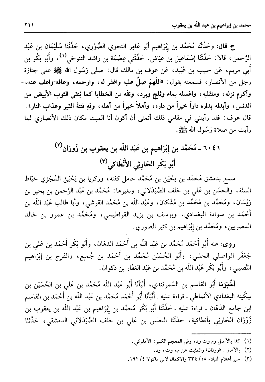6041 - محمد بن إبراهيم بن عبد الله بن يعقوب بن زوزان (2) أبو بكر الحارثي الأنطاكي (3) سمع بدمشق محمد بن يحيى بن محمد حامل كفنه وزكريا بن يحيى السجزي خياط السنة والحسن بن علي بن خلف الصيدلاني وبغيرها محمد بن عبد الرحمن بن بحير بن ريسان ومحمد بن محمد بن مشكان وعبد الله بن محمد القرشي وأبا طالب عبد الله بن أحمد بن سوادة البغدادي ويوسف بن يزيد القراطيسي ومحمد بن عمرو بن خالد المصريين ومحمد بن إبراهيم بن كثير الصوري روى عنه أبو أحمد محمد بن عبد الله بن أحمد الدهان وأبو بكر أحمد بن علي بن جعفر الواصلي الحلبي وأبو الحسين محمد بن أحمد بن جميع والفرج بن إبراهيم النصيبي وأبو بكر عبد الله بن محمد بن عبد الغفار بن ذكوان أخبرنا أبو القاسم بن السمرقندي أنبأنا أبو عبد الله محمد بن علي بن الحسين بن سكينة البغدادي الأنماطي قراءة عليه أنبأنا أبو أحمد محمد بن عبد الله بن أحمد بن القاسم ابن جامع الدهان قراءة عليه حدثنا أبو بكر محمد بن إبراهيم بن عبد الله بن يعقوب بن زوزان الحارثي بأنطاكية حدثنا الحسن بن علي بن خلف الصيدلاني الدمشقي حدثنا