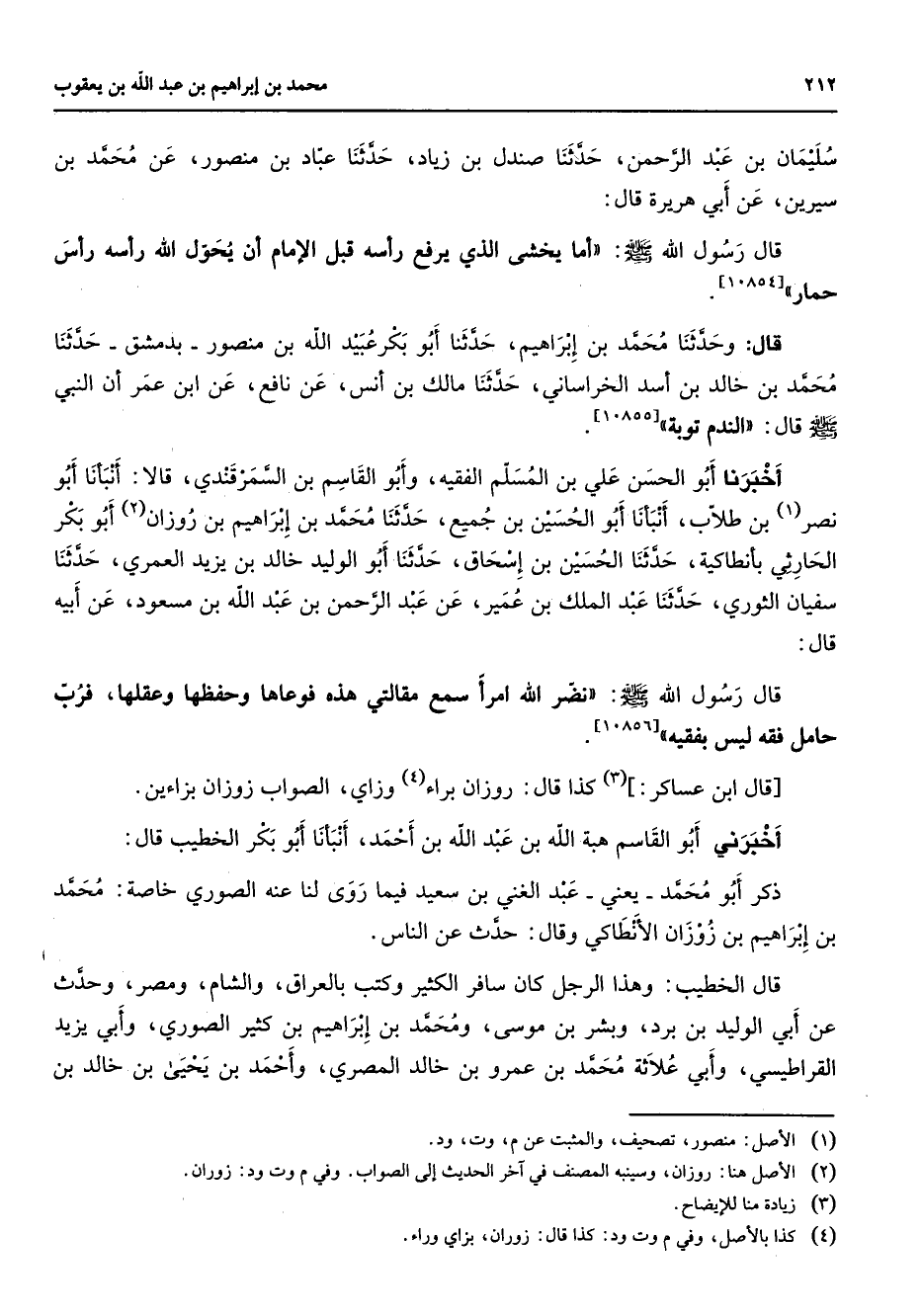 سليمان بن عبد الرحمن حدثنا صندل بن زياد حدثنا عباد بن منصور عن محمد بن سيرين عن أبي هريرة قال قال رسول الله (صلى الله عليه وسلم) أما يخشى الذي يرفع رأسه قبل الإمام أن يحول الله رأسه رأس حمار