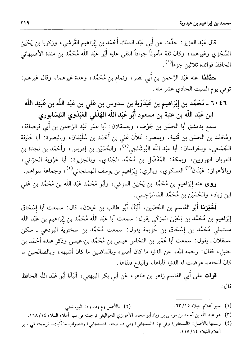 (4) رسمها بالاصل: " السحاني " وفي م: " السنجابي " وفي د وت: " السنجابي " والصواب ما اثبت ترجمته في سير اعلام النبلاء 14 / 115