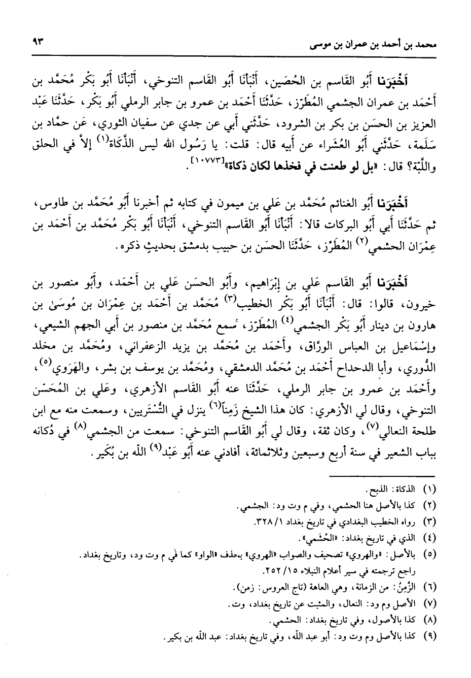 [10773] أخبرنا أبو الغنائم محمد بن علي بن ميمون في كتابه ثم أخبرنا أبو محمد بن طاوس ثم حدثنا أبي أبو البركات قالا أنبأنا أبو القاسم التنوخي أنبأنا أبو بكر محمد بن أحمد بن عمران الحشمي (2) المطرز حدثنا الحسن بن حبيب بدمشق بحديث ذكره أخبرنا أبو القاسم علي بن إبراهيم وأبو الحسن علي بن أحمد وأبو منصور بن خيرون قالوا قال أنبأنا أبو بكر الخطيب (3) محمد بن أحمد بن عمران بن موسى بن هارون بن دينار أبو بكر الجشمي (4) المطرز سمع محمد بن منصور بن أبي الجهم الشيعي وإسماعيل بن العباس الوراق وأحمد بن محمد بن يزيد الزعفراني ومحمد بن مخلد الدوري وأبا الدحداح أحمد بن محمد الدمشقي ومحمد بن يوسف بن بشر والهروي (5) وأحمد بن عمرو بن جابر الرملي حدثنا عنه أبو القاسم الأزهري وعلي بن المحسن التنوخي وقال لي الأزهري كان هذا الشيخ زمنا (6) ينزل في التستريين وسمعت منه مع ابن طلحة النعالي (7) وكان ثقة وقال لي أبو القاسم التنوخي سمعت من الجشمي (8) في دكانه بباب الشعير في سنة أربع وسبعين وثلاثمائة أفادني عنه أبو عبد (9) الله بن بكير