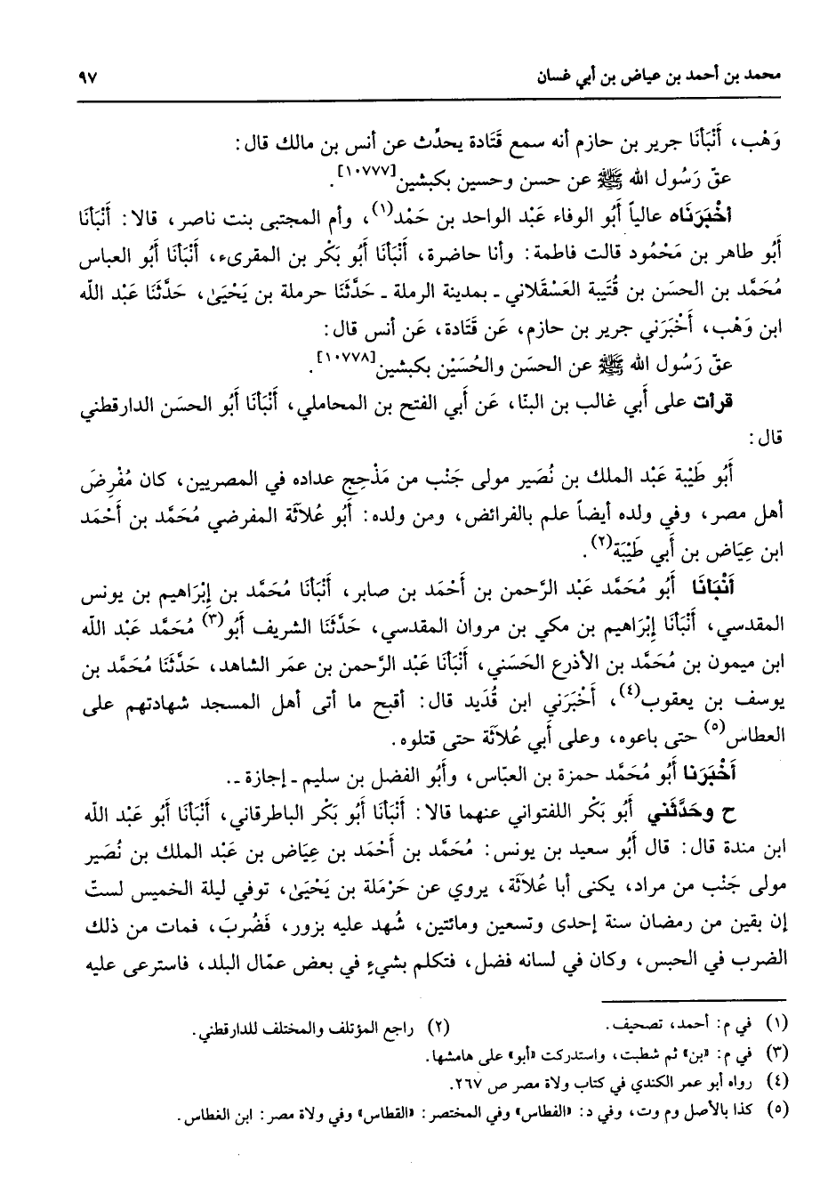 [10778] قرأت على أبي غالب بن البنا عن أبي الفتح بن المحاملي أنبأنا أبو الحسن الدارقطني قال أبو طيبة عبد الملك بن نصير مولى جنب من مذحج عداده في المصريين كان مفرض أهل مصر وفي ولده أيضا علم بالفرائض ومن ولده أبو علاثة المفرضي محمد بن أحمد ابن عياض بن أبي طيبة (2) أنبأنا أبو محمد عبد الرحمن بن أحمد بن صابر أنبأنا محمد بن إبراهيم بن يونس المقدسي أنبأنا إبراهيم بن مكي بن مروان المقدسي حدثنا الشريف أبو (3) محمد عبد الله ابن ميمون بن محمد بن الأذرع الحسني أنبأنا عبد الرحمن بن عمر الشاهد حدثنا محمد بن يوسف بن يعقوب (4) أخبرني ابن قديدقال أقبح ما أتى أهل المسجد شهادتهم على العطاس (5) حتى باعوه وعلى أبي علاثة حتى قتلوه أخبرنا أبو محمد حمزة بن العباس وأبو الفضل بن سليم إجازة ح وحدثني أبو بكر اللفتواني عنهما قالا أنبأنا أبو بكر الباطرقاني أنبأنا أبو عبد الله ابن مندة قال قال أبو سعيد بن يونس محمد بن أحمد بن عياض بن عبد الملك بن نصير مولى جنب من مراد يكنى أبا علاثة يروي عن حرملة بن يحيى توفي ليلة الخميس لست إن بقين من رمضان سنة إحدى وتسعين ومائتين شهد عليه بزور فضرب فمات من ذلك الضرب في الحبس وكان في لسانه فضل فتكلم بشئ في بعض عمال البلد فاسترعى عليه