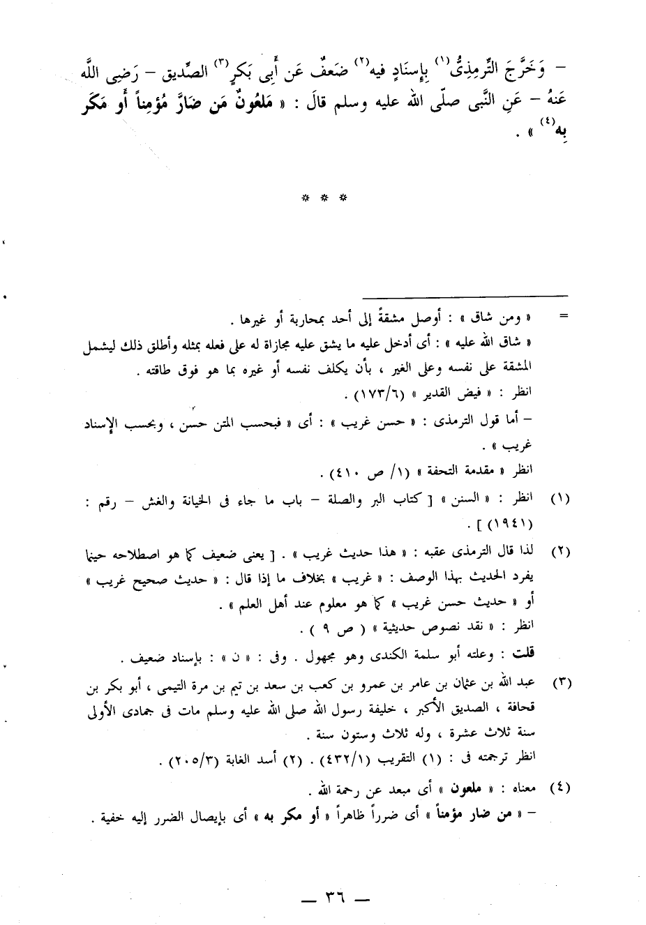 وخرج الترمذي بإسناد فيه ضعف عن أبي بكر الصديق - رضي الله عنه - عن النبي صلى الله عليه وسلم قال: (مَلعُونٌ مَن ضَارَّ مُؤمِناً أَو مَكَر بِه) .