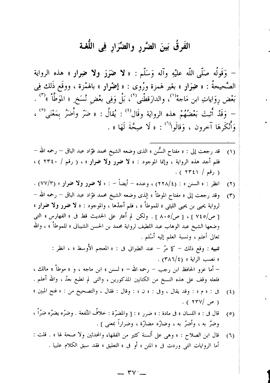 وقوله صلى الله عليه وآله وسلم: (لا ضَرَرَ ولا ضِرار) هذه الرواية الصحيحة: (ضرار) بغير همزة وروى: (إضرار) بالهمزة، ووقع ذلك في بعض روايات ابن ماجه، والدارقطنى، بل وفي بعض نسخ (الموطأ) .
