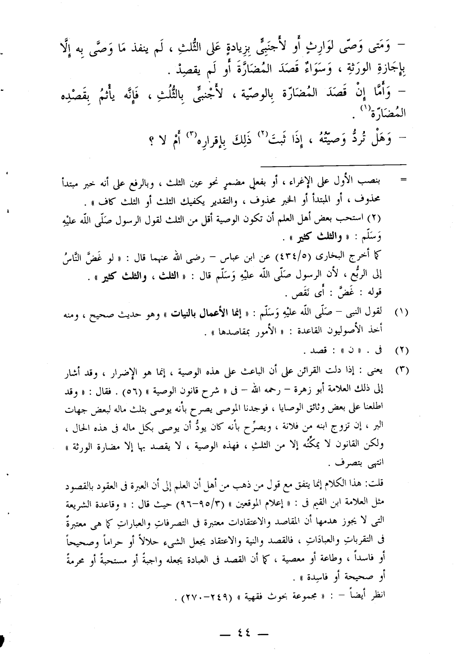 وأما إن قصد المضارة بالوصية، لأجنبى بالثلث، فإنه يأثم بقصده المضارة.