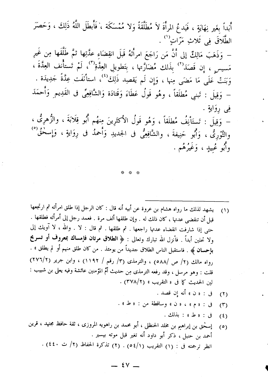 وقيل: تستأنف مطلقا، وهو قول الأكثرين منهم أبو قلابة، والزهرى، والثورى، وأبو حنيفة، والشافعى، في الجديد وأحمد في رواية، وإسحاق، وأبو عبيد، وغيرهم.