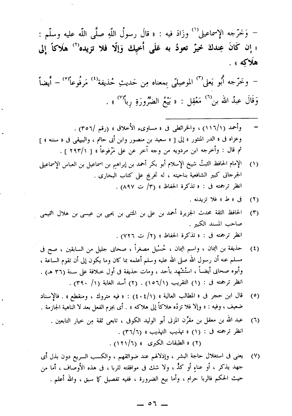 وخرجه أبو يعلى الموصلى بمعناه من حديث حذيفة مرفوعا - أيضا وقال عبد الله بن معقل: (بيع الضرورة ربا) .