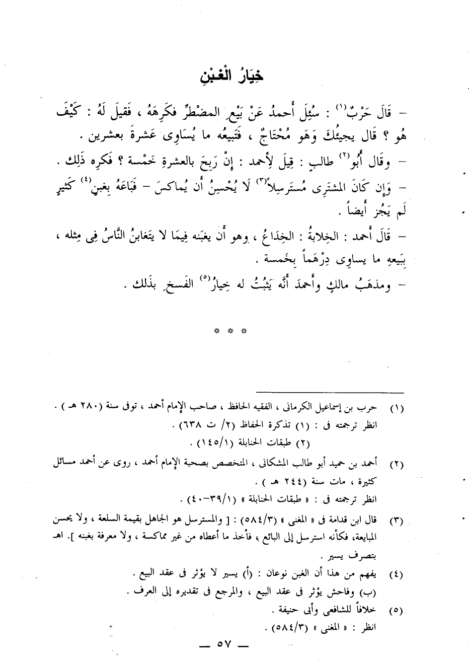 قال أحمد: الخلابة: الخداع، وهو أن يغبنه فيما لا يتغابن الناس في مثله، ببيعه ما يساوى درهما بخمسة.