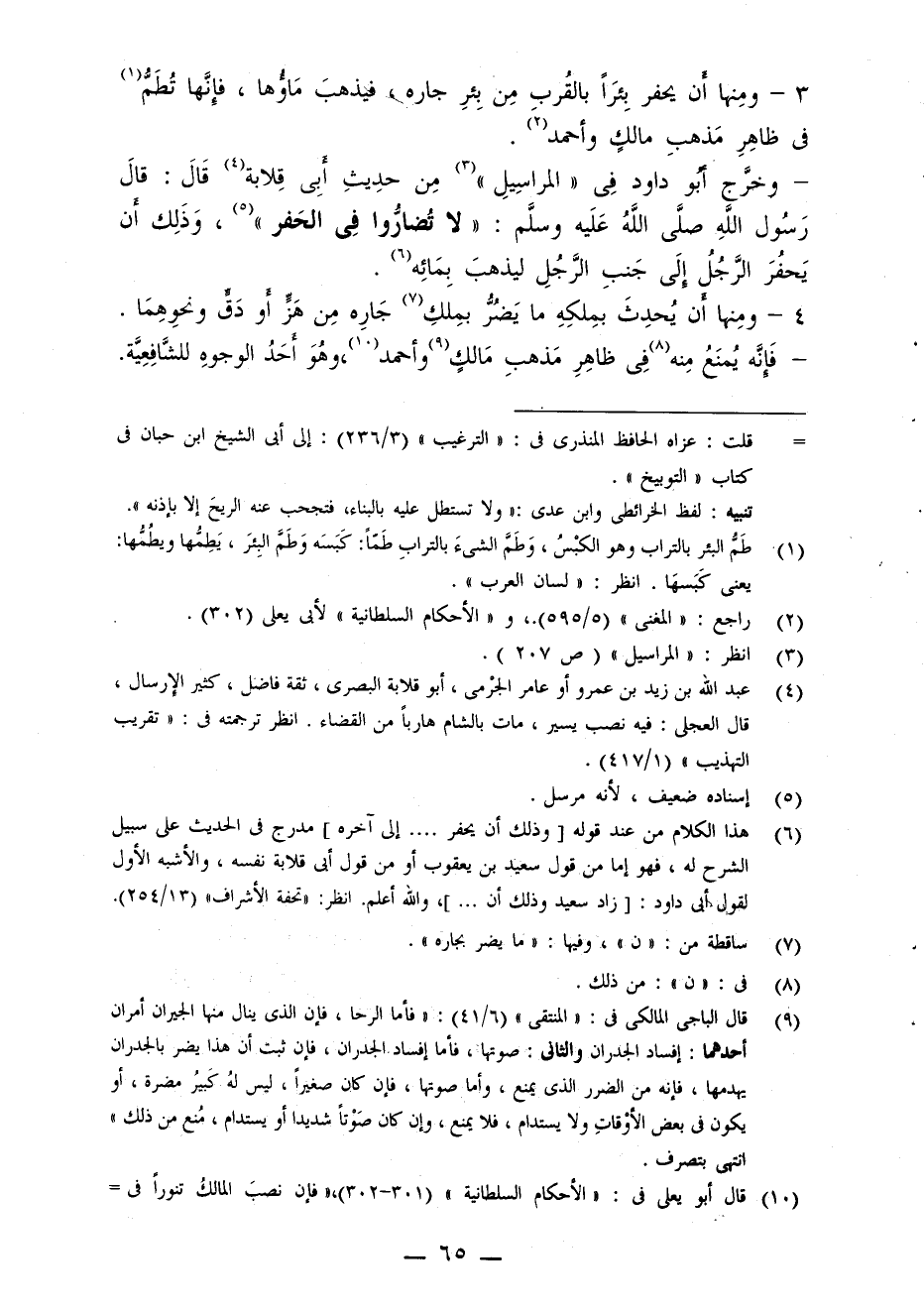 4 - وخرج أبو داود في (المراسيل) من حديث أبى قلابة قال: قال رسول الله صلى الله عليه وسلم: (لا تُضارُّوا في الحَفر) ، وذلك أن يحفر الرجل إلى جنب الرجل ليذهب بمائة.