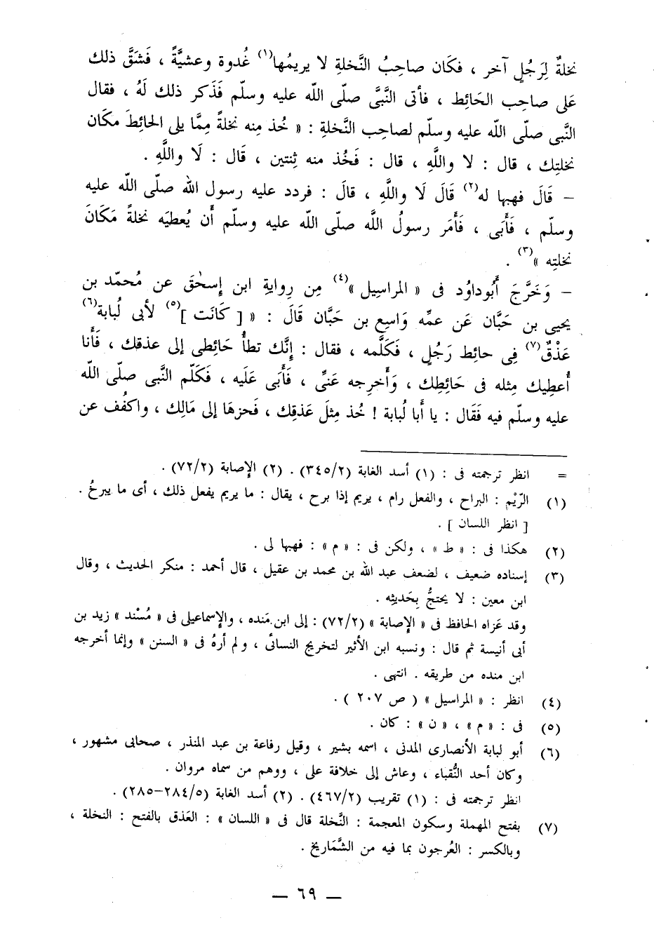 وخرج أبو داود في (المراسيل) من رواية ابن إسحاق عن محمد بن يحيى بن حبان عن عمه واسع بن حبان قال: (كَانَت لأبى لُبابة عَذقٌ في حائِط رَجُلٍ، فَكَلَّمه، فقال: إِنَّك تطأُ حَائِطى إلى عذقك، فَأَنا أُعطِيك مِثله في حَائِطِك، وَأَخرِجه عَنىَّ، فَأَبَى عَلَيه، فَكَلّم النَّبى صلّى الله عليه وسلّم فيه فَقَال: يا أَبا لُبابة! خُذ مِثلَ عَذقِك، فَحزهَا إلى مَالِك، واكفُف عن