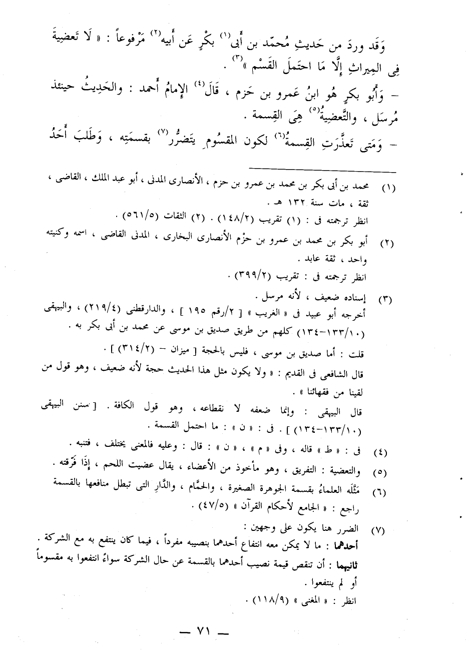 وأبو بكر هو ابن عمرو بن حزم، قال الإمام أحمد: والحديث حينئذ مرسل، والتعضية هى القسمة.