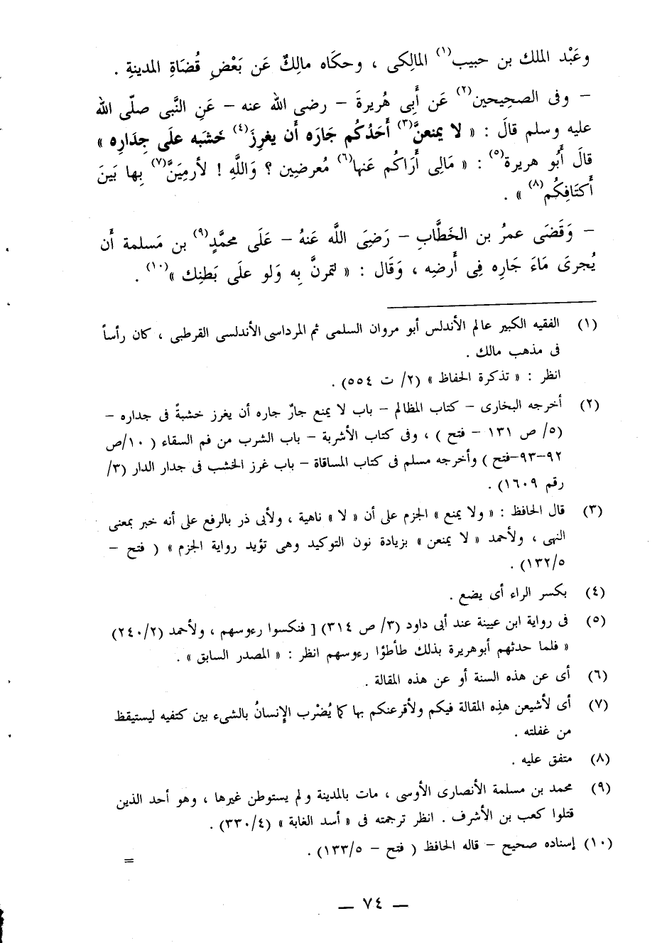 وقضى عمر بن خطاب - رضى الله عنه - على محمد بن مسلمة أن يجرى ماء جاره في أرضه، وقال: (لتمرنَّ بِه وَلو علَى بَطِنك) .