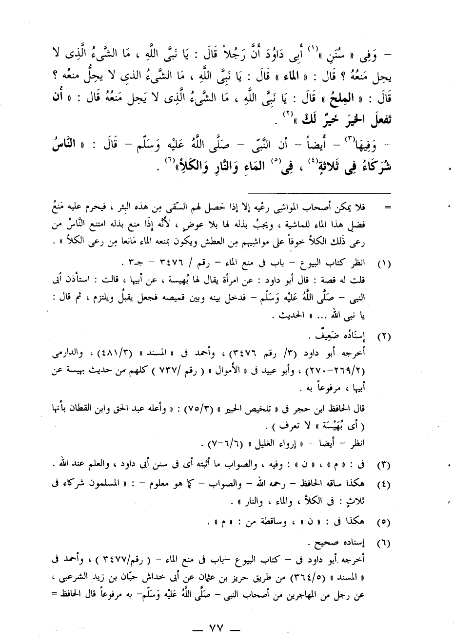 وفى (سنن) أبى داود أن رجلا قال: يا نبى الله، ما الشئ الذى لا يحل منعه؟ قال: (الماء) قال: يا نبى الله، ما الشئ الذى لا يحل منعه؟ قال: (المِلحُ) قال: يا نبى الله، ما الشئ الذى لا يحل منعه؟ قال: (أَن تَفعلَ الخيرَ خَيرٌ لَك) .