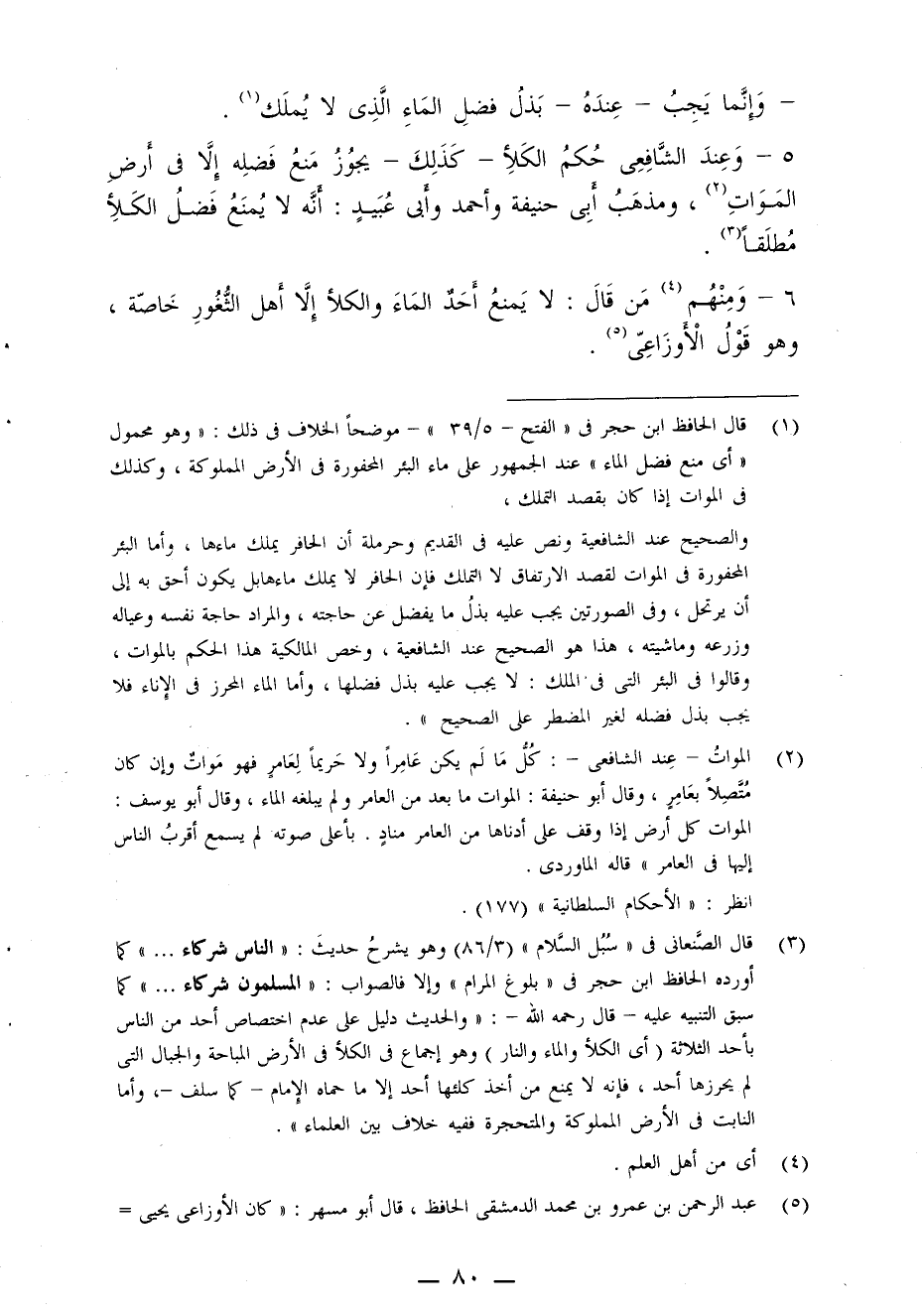 5 - وعند الشافعى حكم الكلأ - كذلك - يجوز منع فضله إلا في أرض الموات، ومذهب أبى حنيفة وأحمد وأبى عبيد: أنه لا يمنع فضل الكلأ مطلقا.