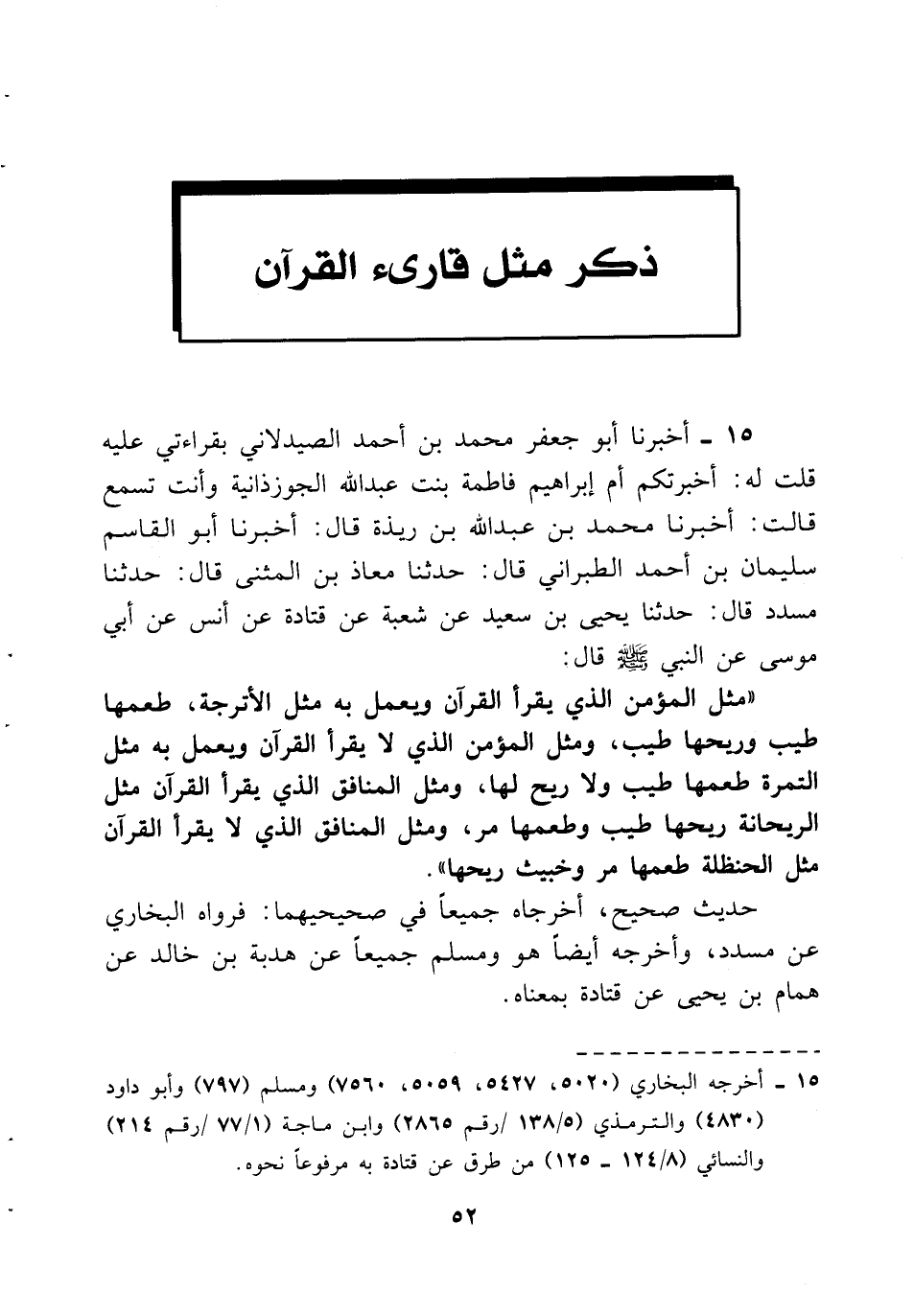 ((مثل المؤمن الذي يقرأ القرآن ويعمل به مثل الأترجة, طعمها وريحها طيب, ومثل المؤمن الذي لا يقرأ القرآن ويعمل به مثل التمرة طعمها طيب ولا ريح لها, ومثل المنافق الذي يقرأ القرآن مثل الريحانة ريحها طيب وطعمها مر, ومثل المنافق الذي لا يقرأ القرآن مثل الحنظلة طعمها مر وخبيث ريحها)) .