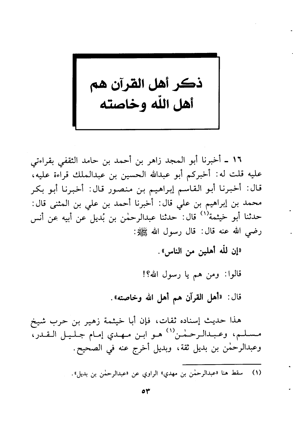 16- أخبرنا أبو المجد زاهر بن أحمد بن حامد الثقفي بقراءتي عليه قلت له: أخبركم أبو عبد الله الحسين بن عبد الملك قراءة عليه, قال: أخبرنا أبو القاسم إبراهيم بن منصور قال: أخبرنا أبو بكر محمد بن إبراهيم بن علي قال: أخبرنا أحمد بن علي بن المثنى قال: حدثنا أبو خيثمة قال: حدثنا عبد الرحمن بن بديل عن أبيه عن أنس رضي الله عنه قال: قال رسول الله صلى الله عليه وسلم: