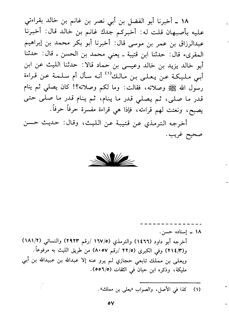 18- أخبرنا أبو الفضل بن أبي نصر بن غانم بن خالد بقراءتي عليه بأصبهان قلت له: أخبركم جدك غانم بن خالد قال: أخبرنا عبد الرزاق بن عمر بن موسى قال: أخبرنا أبو بكر محمد بن إبراهيم المقرئ قال: حدثنا ابن قتيبة –يعني محمد بن الحسن- قال: حدثنا أبو خالد يزيد بن خالد وعيسى بن حماد قالا: حدثنا الليث عن ابن أبي مليكة عن يعلى بن مالك أنه سأل أم سلمة عن قراءة رسول الله صلى الله عليه وسلم وصلاته, فقالت: وما لكم وصلاته؟! كان يصلي ثم ينام قدر ما صلى, ثم يصلي قدر ما ينام, ثم ينام قدر ما صلى حتى يصبح, ونعتت لهم قراءته, فإذا هي قراءة مفسرة حرفاً حرفاً.