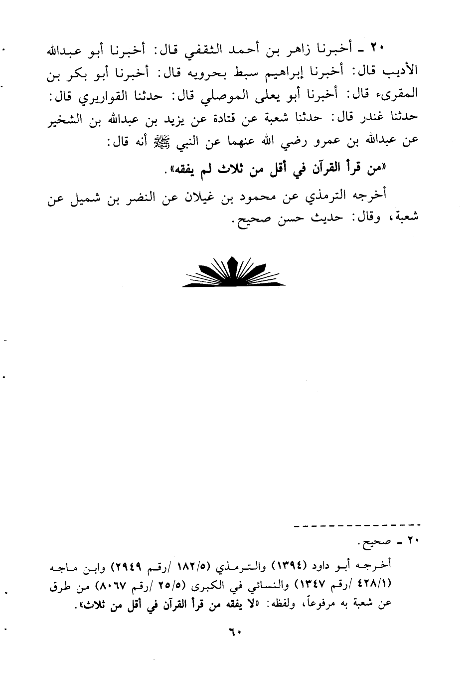 20- أخبرنا زاهر بن أحمد الثقفي قال: أخبرنا أبو عبد الله الأديب قال: أخبرنا إبراهيم سبط بحرويه قال: أخبرنا أبو بكر بن المقرئ قال: أخبرنا أبو يعلى الموصلي قال: حدثنا القواريري قال: حدثنا غندر قال: حدثنا شعبة عن قتادة عن يزيد بن عبد الله بن الشخير عن عبد الله بن عمرو رضي الله عنهما عن النبي صلى الله عليه وسلم أنه قال: