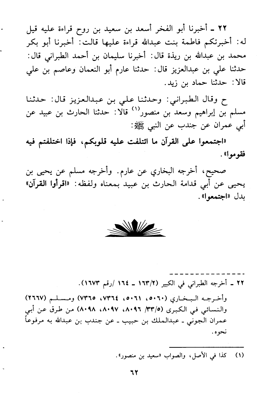 22- أخبرنا أبو الفخر أسعد بن سعيد بن روح قراءة عليه قيل له: أخبرتكم فاطمة بنت عبد الله قراءة عليها قالت: أخبرنا أبو بكر محمد بن عبد الله بن ريذة قال: أخبرنا سليمان بن أحمد الطبراني قال: حدثنا علي بن عبد العزيز قال: حدثنا عارم أبو النعمان وعاصم بن علي قالا: حدثنا حماد بن زيد.